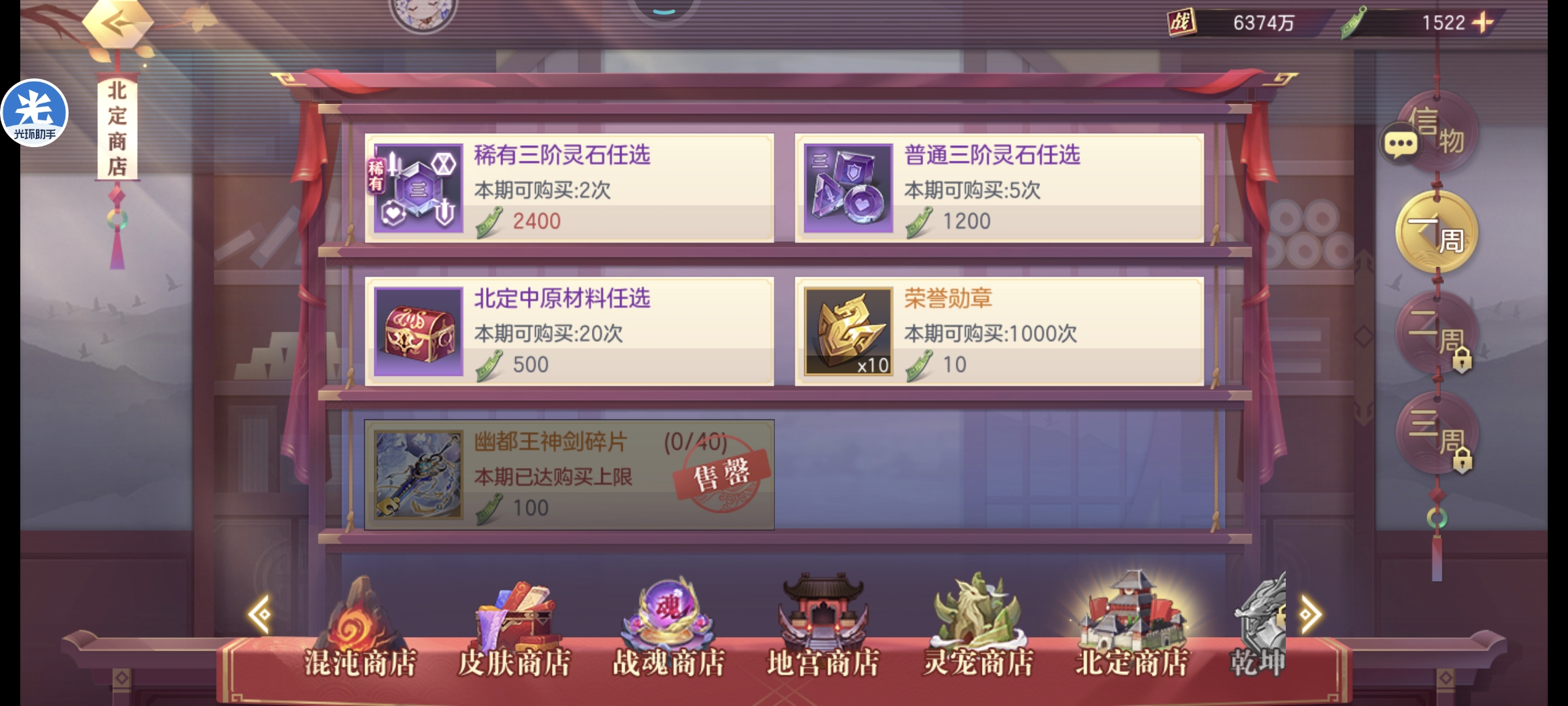 北定商店除了自己所需要的信物优先选择风物志和无双命魂石 。注:后续有风物志的任何活动都是优先风物志