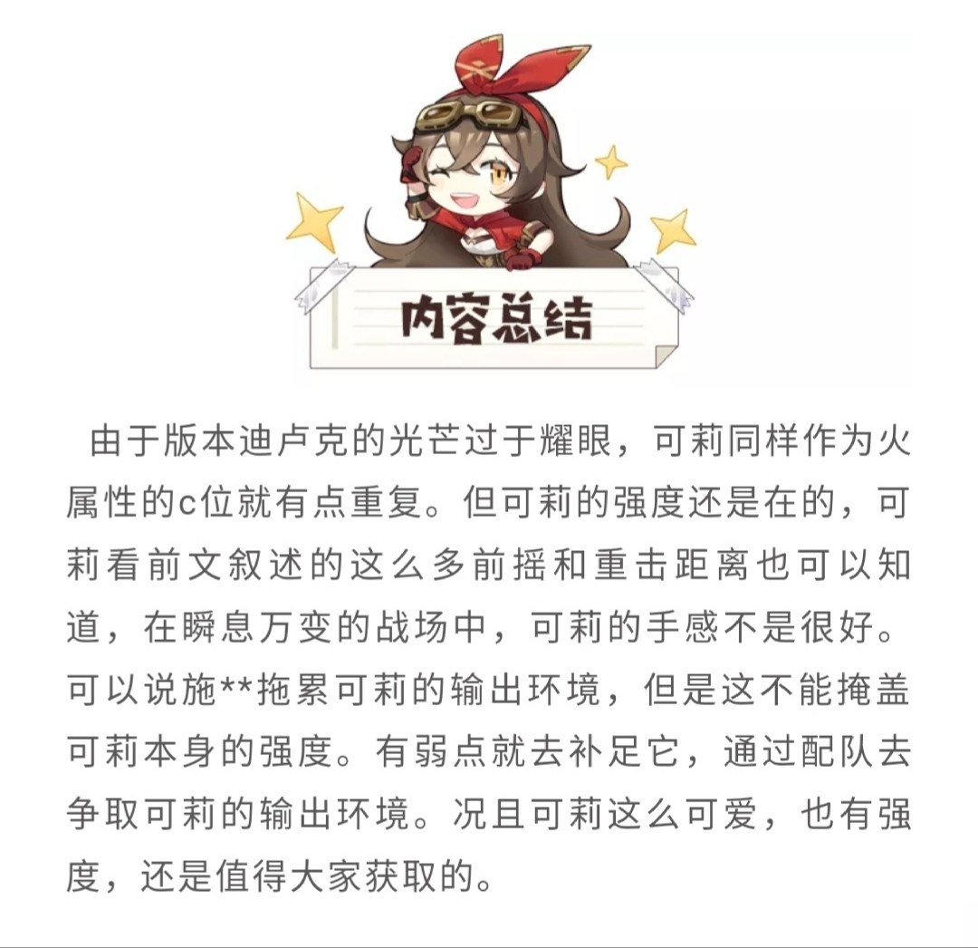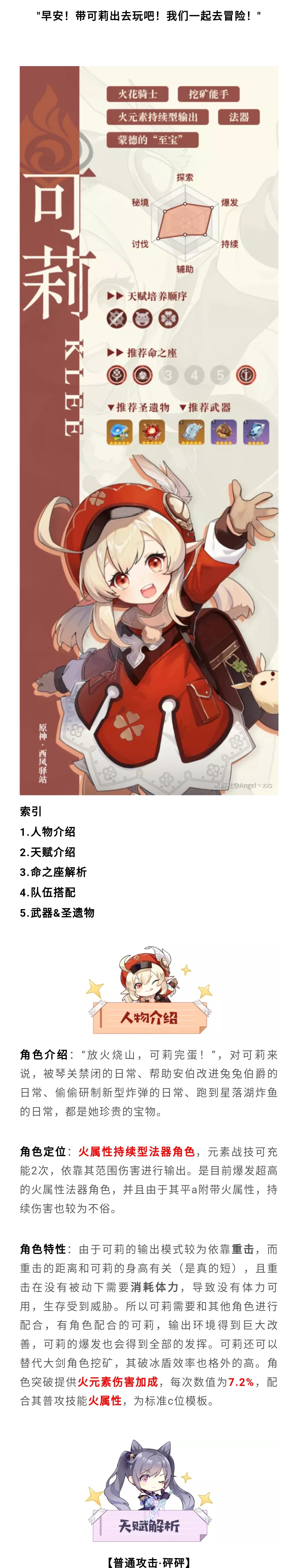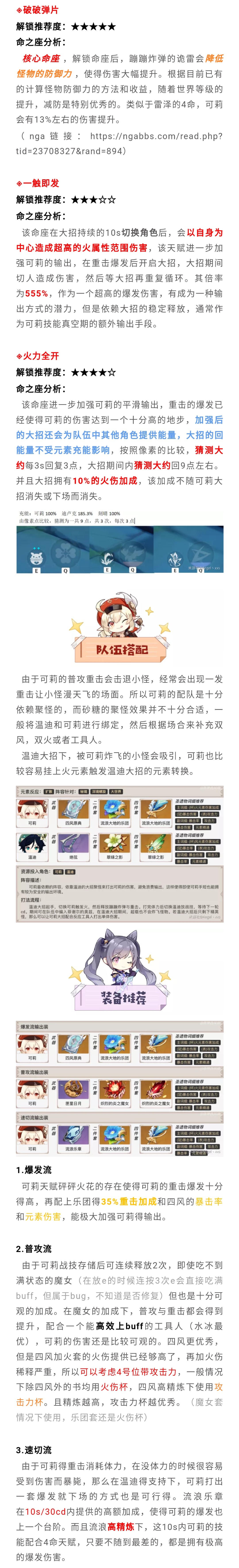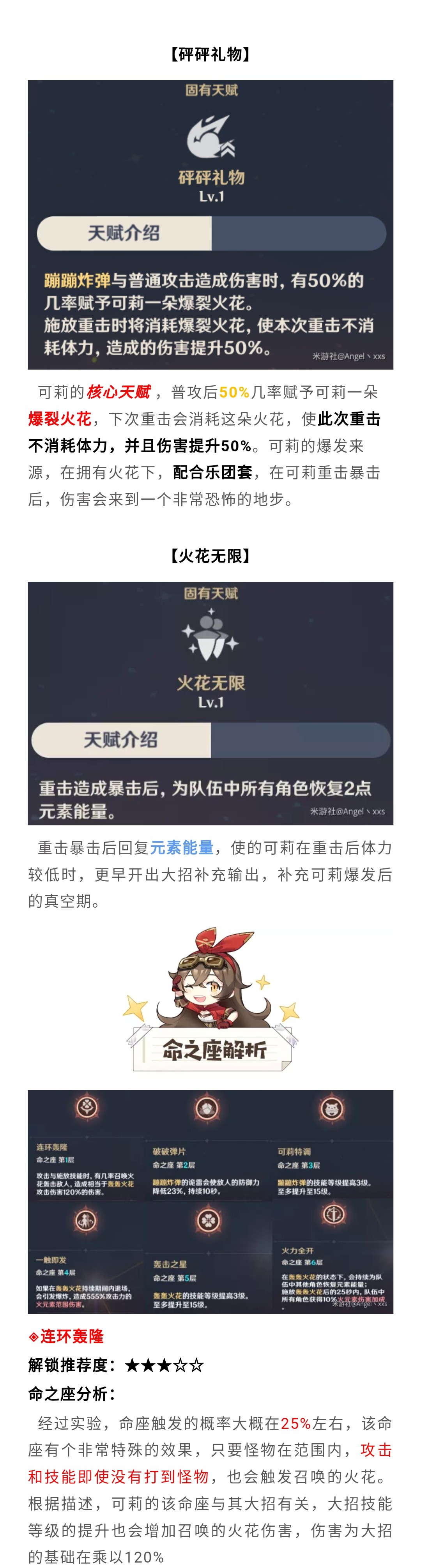 轰轰火花可以触发元素反应,并且可以享受暴击和爆伤收益,由于只需要60点能量且有天赋回能量,所以并不担心能量不够用。大招是可莉驻场输出比较关键的技能,并且在开启6命后还会为队伍中其他角色提供能量,整体收益十分可观。
