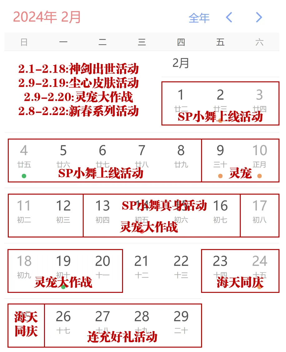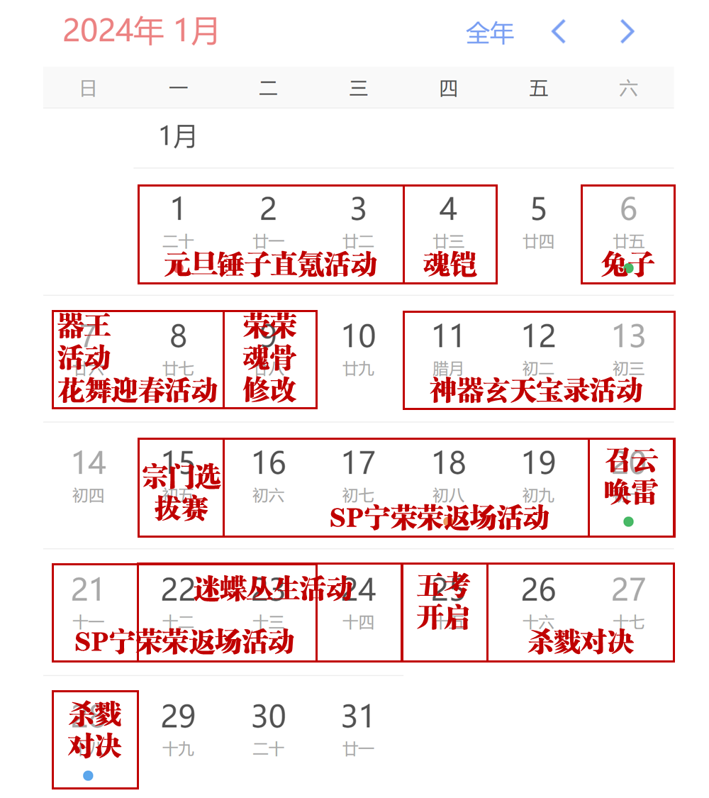 来来来,咱们先看看2024年1月份全月的活动日历,上面这个图真是太拥挤了,因为维一已经感觉容不下1月份所有上线的活动了,那么除了日常基础的活动外,上图中标注的都是在2024年1月份期间官方额外上线的活动: