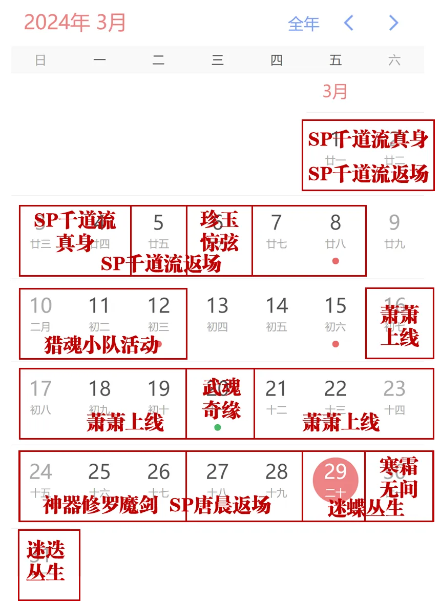 只想问这样的3月精不精彩?只有13-15号这3天没有额外的活动,此外明天3月30日将会有同时4个额外活动在线......SP唐晨返场+迷蝶丛生+寒霜无间+九宝神塔......绝了啊真是绝了,这到底2024年要干啥?真心希望官方能体谅一下普通玩家们的承受耐久度,这耐久真给打到零就不好玩了啊......