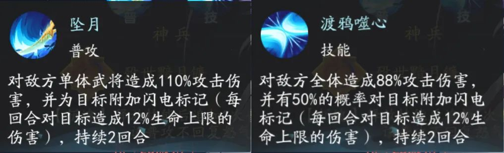 司马懿拥有特殊的【闪电标记】,该效果能够每回合对敌方目标造成12%生命上限的伤害。普攻【坠月】和技能【渡鸦噬心】分别能够为敌方单体和全体附加闪电标记(技能有50%概率为目标附加闪电标记)。