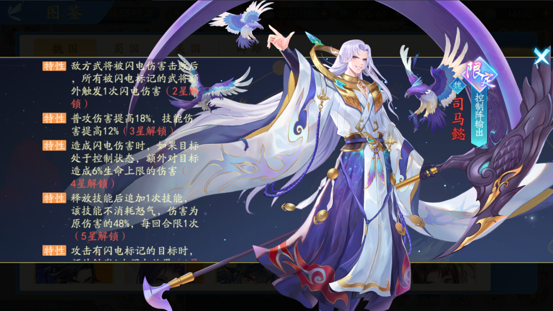 升至2星,提升司马懿的清场能力,如果敌方有多个残血武将,当1位被闪电伤害击败后,会对其他武将产生连锁闪电伤害,被“一路火花带闪电”的带走。升至4星,闪电标记造成的伤害提升至18%生命上限。升至6星,降低触发额外1次的闪电伤害门槛,配合5星特性释放技能后追加1次技能,能够更频繁地触发2星特性。