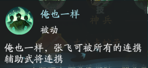 张飞在原有蜀国武将能够连携再动的基础上,被动【俺也一样】打破了对连携辅助的限制,减轻了蜀国阵营由于依赖连携辅助而位置吃紧的问题。