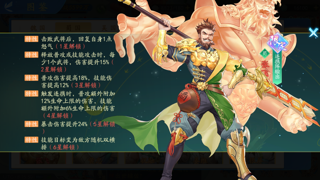 升至2星,张飞在攻击造成敌方武将退场时获得伤害提升,凸显处理残局的优势。升至4星,张飞连携时打出的普攻和技能附加生命上限百分比的伤害。升至6星,张飞技能范围扩大至敌方随机双横排,提高了对于敌方后排的威胁能力。