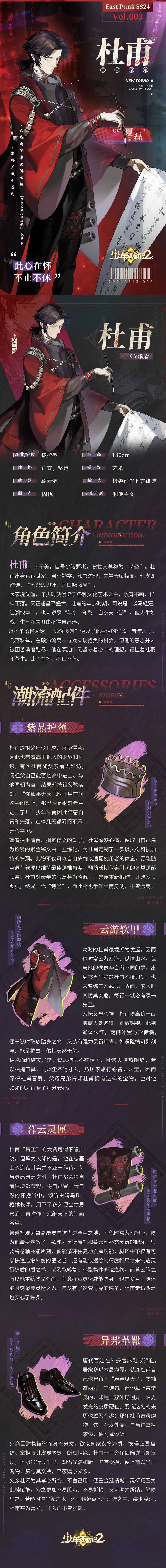 东土风物志·人物篇丨杜甫少年西游记2 - 新闻星发布于 2024-03-30关注角色阵营:钦天角色定位:援护型//杜甫,世人尊称他为“诗圣”。他的诗作中,以雄浑,激昂的语言,表达社会矛盾和人民疾苦,被誉为“诗史”。开创了”即事名篇”的新乐府诗题材。后世李商隐,韩愈等诗人均受其影响。//杜甫惟愿:[安得广厦千万间,大庇天下寒士俱欢颜,风雨不动安如山!!]