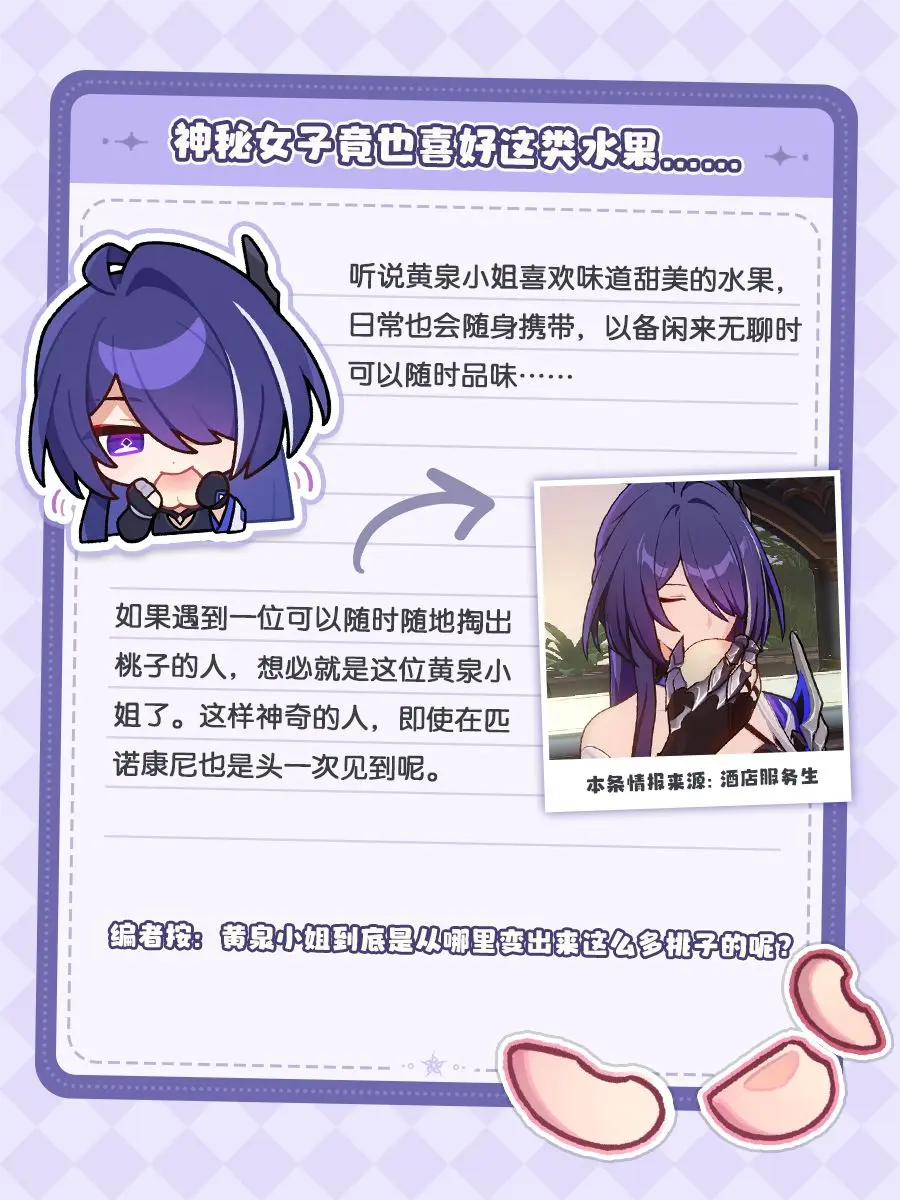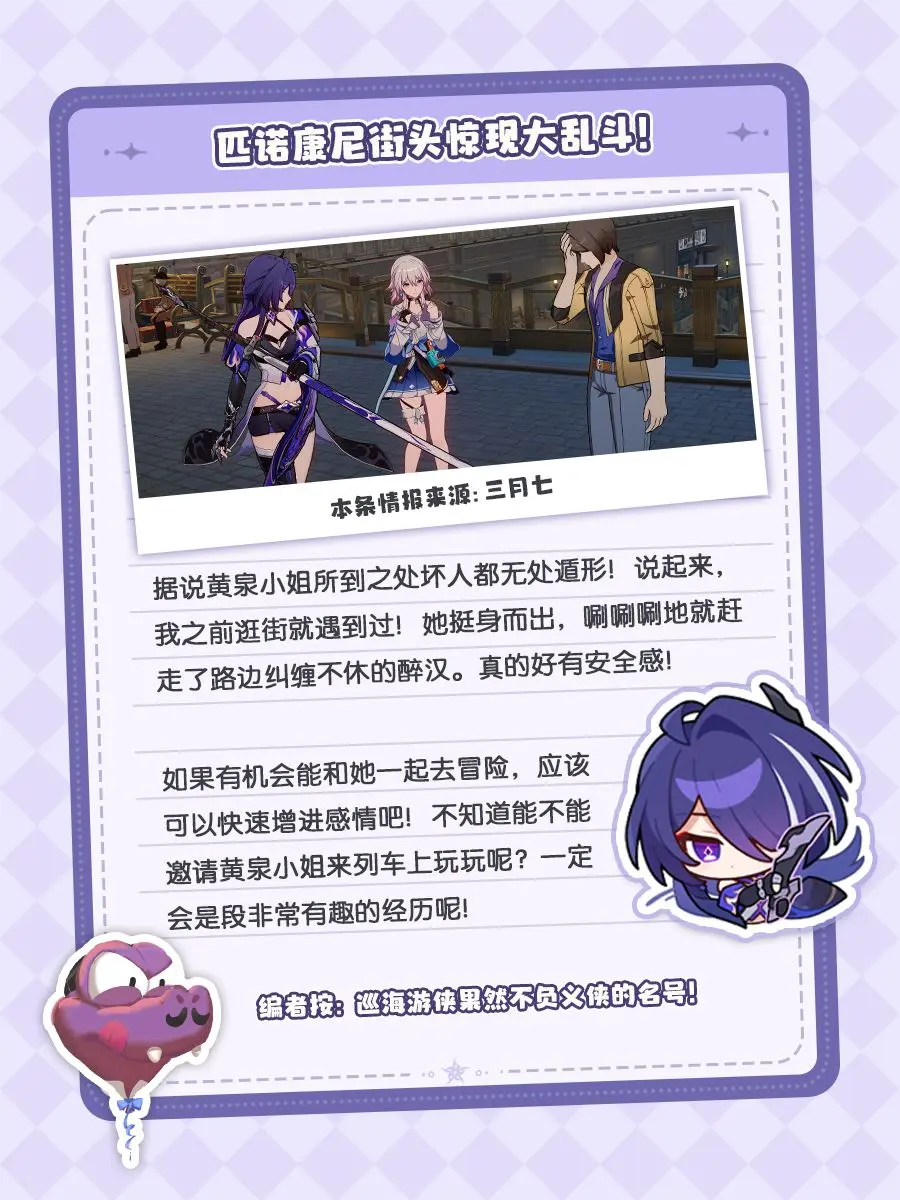 揭秘!号称巡海游侠的那位「黄泉」崩坏:星穹铁道 - 新闻星发布于 2024-03-30关注 早上中午晚上好,我是不知名的本报记者。近日匹诺康尼出现一位号称巡海游侠的神秘女子,紫发紫眸、手持长刃。根据可靠线人投稿,此人行走江湖时的以「黄泉」为名。接下来就由我跟踪报道,为大家揭秘更多独家线索!