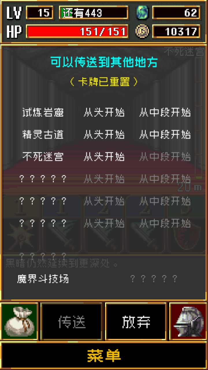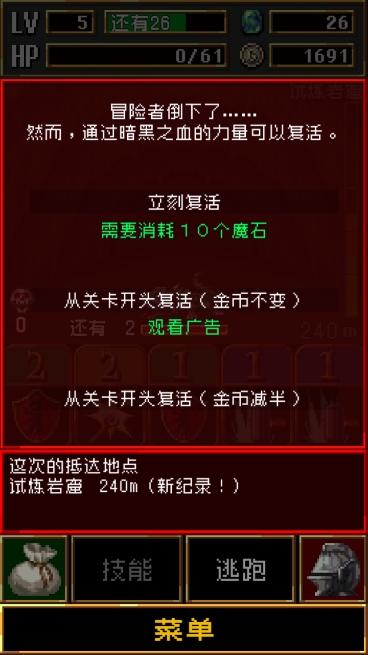 游戏还有一点很值得称道。尽管玩家死亡后就需要重来,但是游戏还有复活系统。除了用来升级装备的魔石可以复活玩家,还能通过金币和广告复活。这样贴心的设计让玩家们能够更加从容的面对游戏中的各类怪物。当你发现你的能力不足以挑战这个场景里的怪物时,别担心,游戏还设计了传送的功能,你是能够回到上个场景继续挑战和磨练自己的。