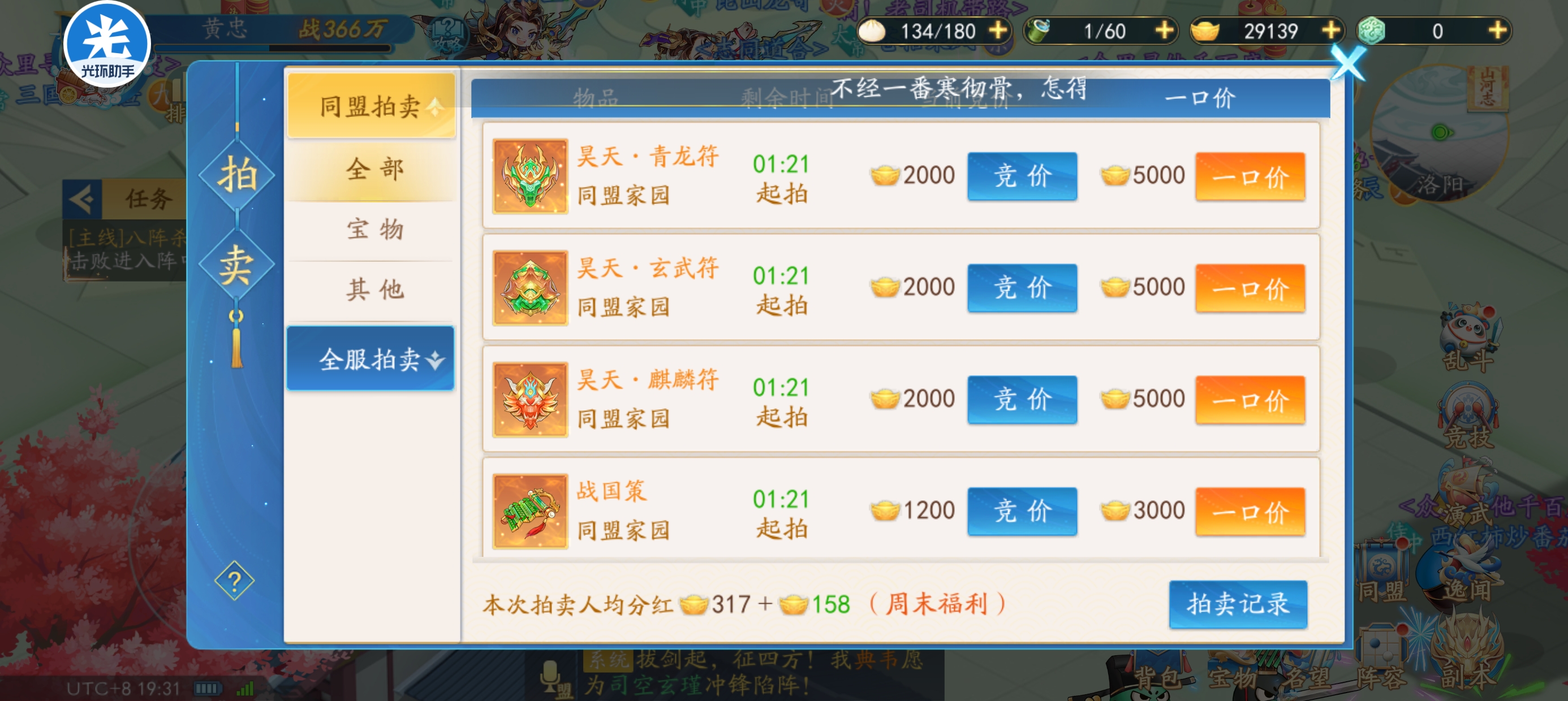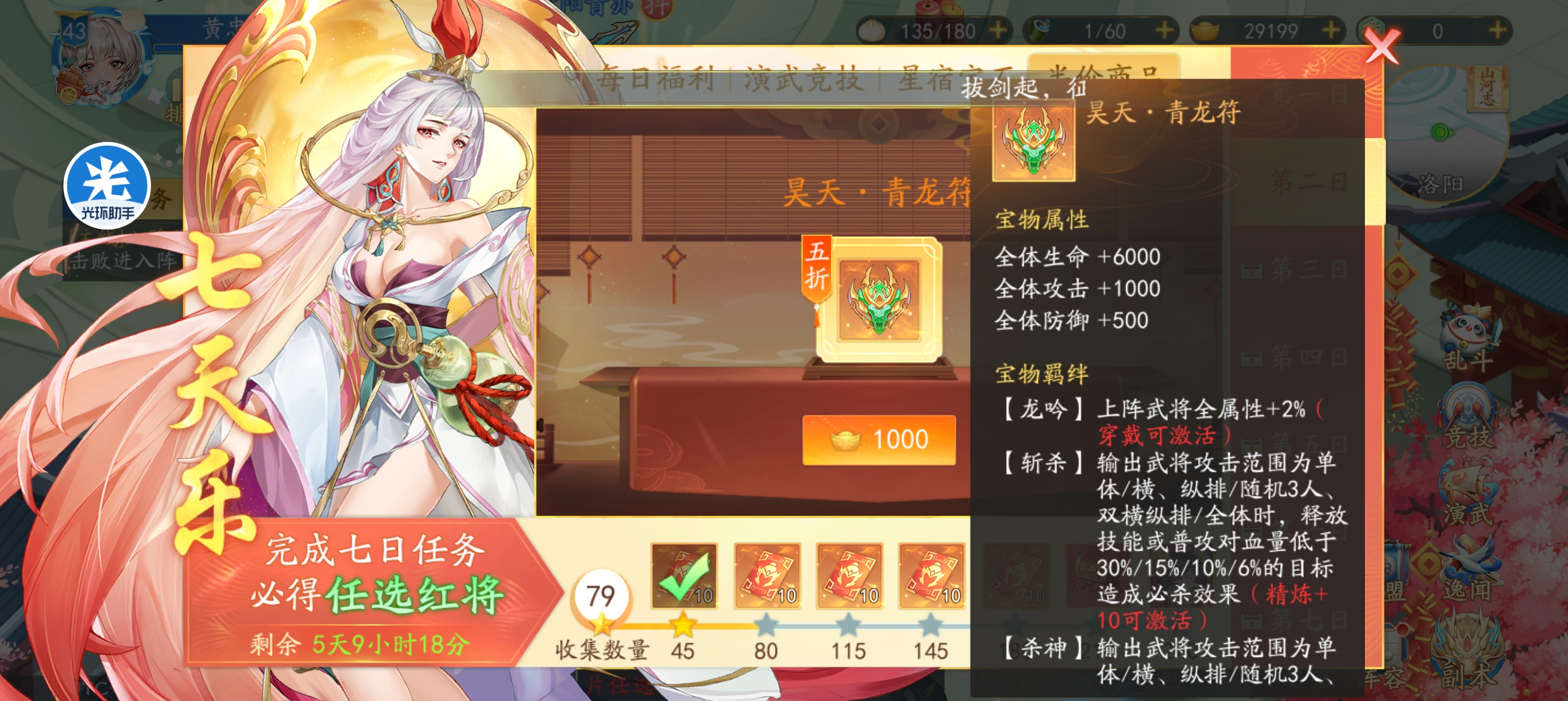 另外七天乐中今天是第二天,第二天有一个打五折的昊天青龙符。平民看见还是要购买的,以竞拍,竞技场里面的橙色。青龙符基本上要3000元宝,前期竞拍的人起价比较高。所以明显七天乐中的第二天半折,更优惠、性价比更高。前期平民必买只需要花1000元宝。