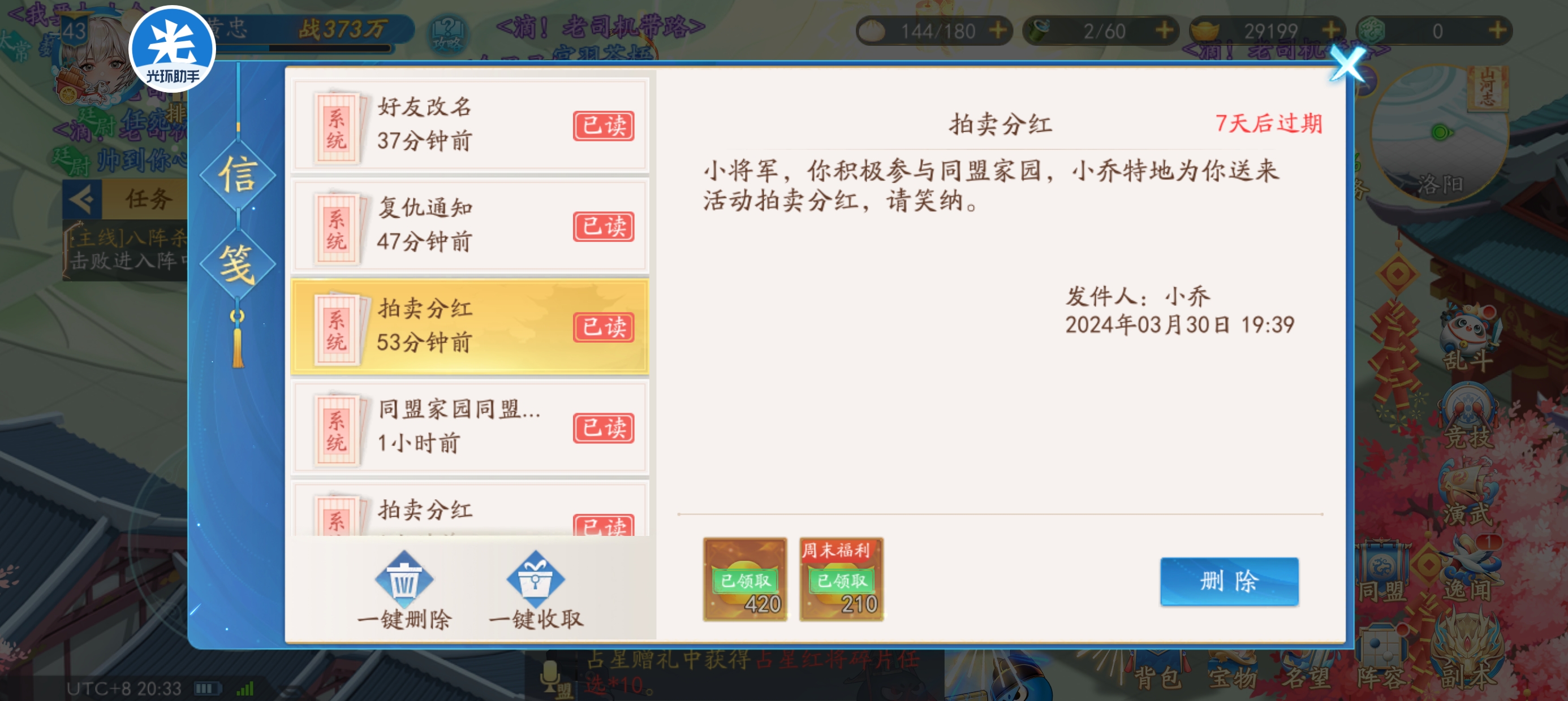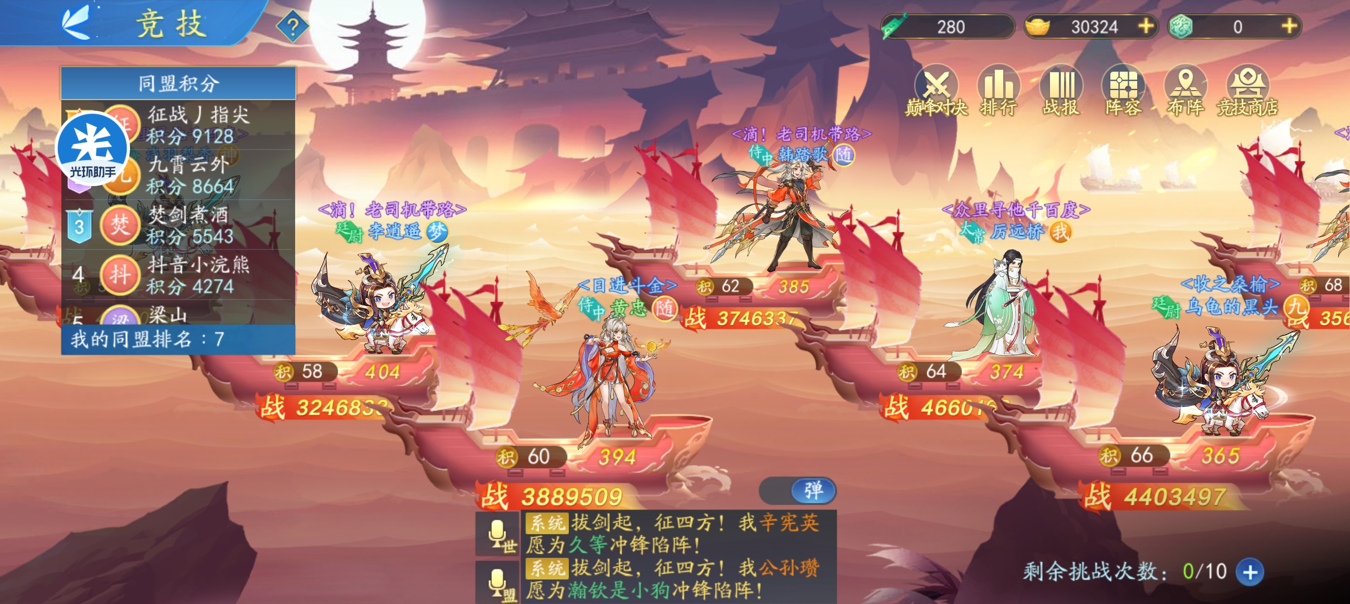 目前所在的同盟排名第七。联盟排名算中等,竞拍依旧激烈。今天最高战力来到了383万,等级44级,竞技场排名接近400名,元宝一共攒到了3万元,副本29-4。