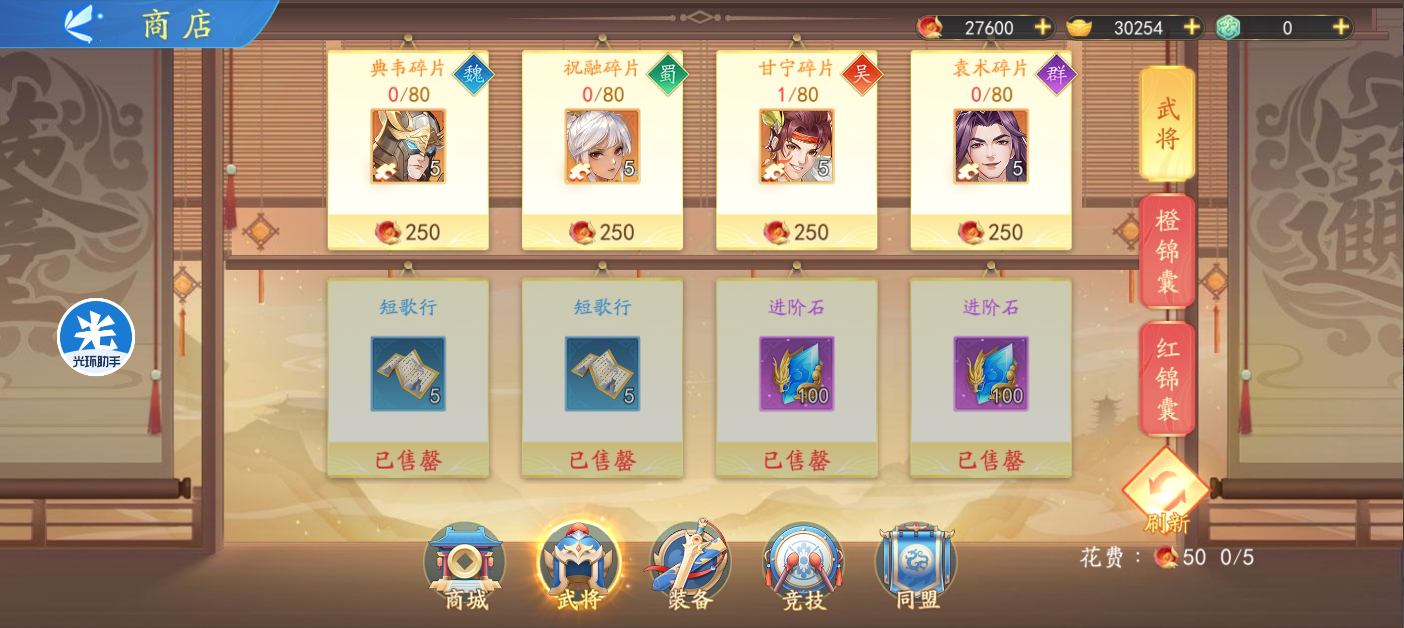 武将商店这里需要注意一下。看见黄忠、曹冲、孙尚香、郭嘉、徐庶和曹植等。这类卡的碎片是一定要购买,由于前两天经常抽卡,红色宝石比较多。前期可以每天50红色宝石刷十次来刷新自己阵营的碎片收集,另外我推荐最底下一排的觉醒石以及升级经验书之类的。可以花红色石头前期购买,因为后面会缺。