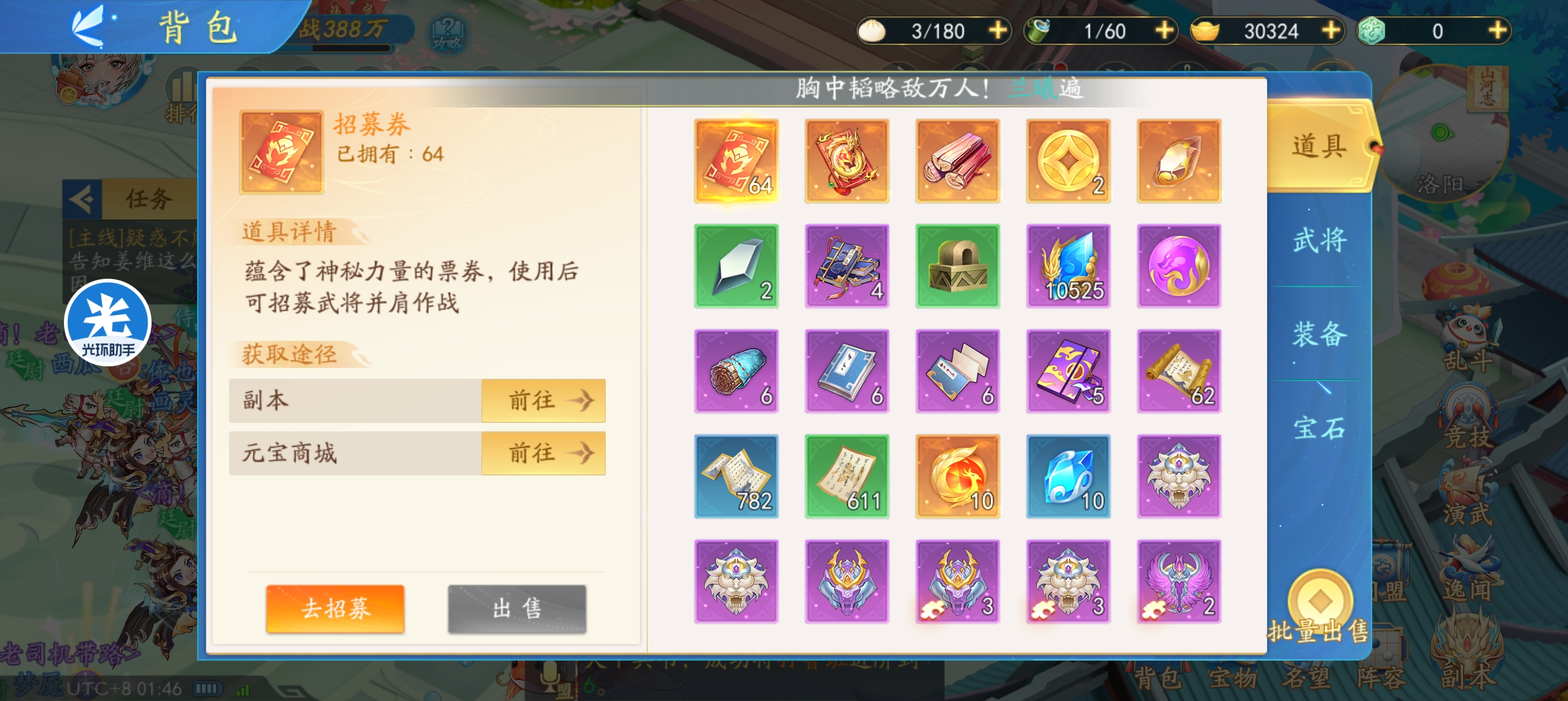 还记得我前面提到过,今天和明天的任务是攒够70抽。然后明天一举拿下300抽的郭嘉。我给大家看一下今天的背包基本上已还没有到明天就已经凑齐64多抽了。