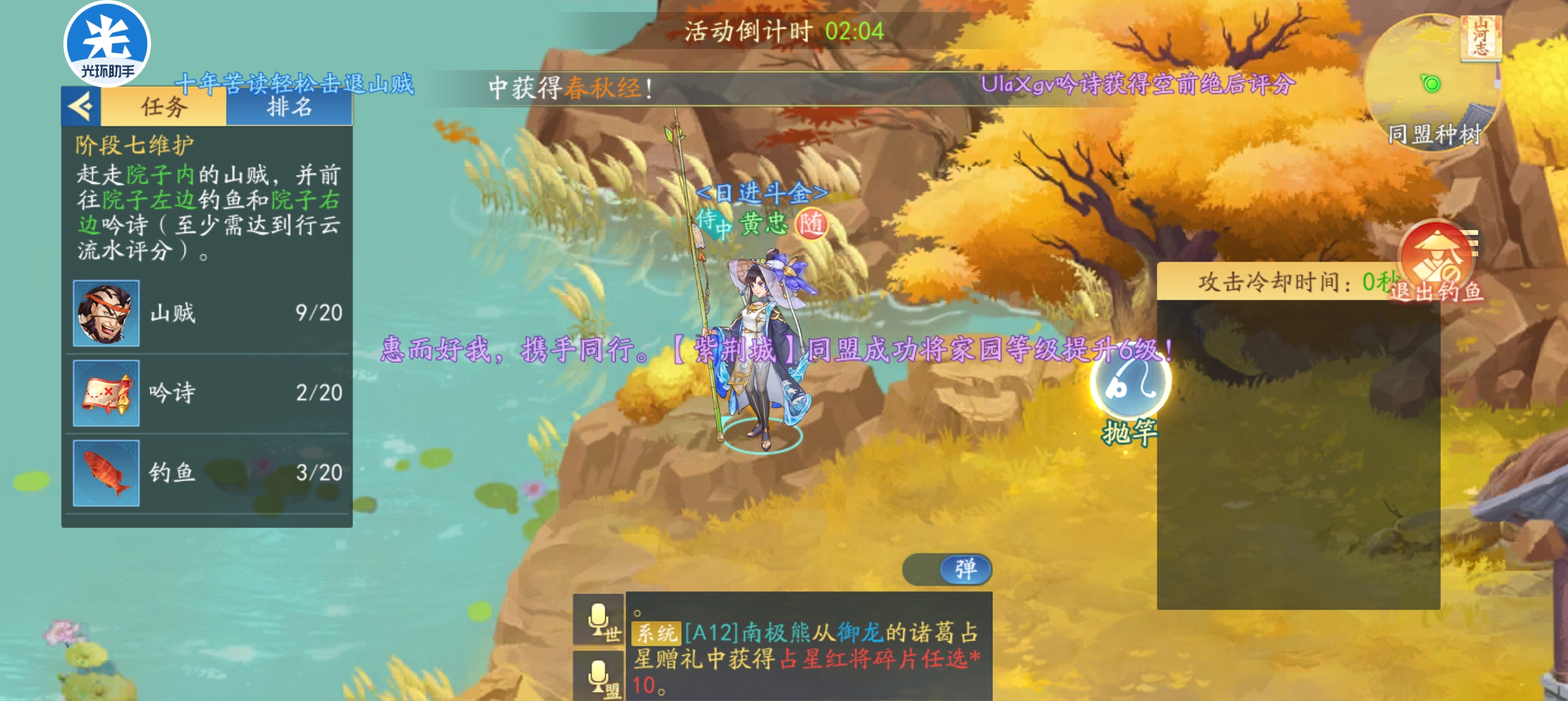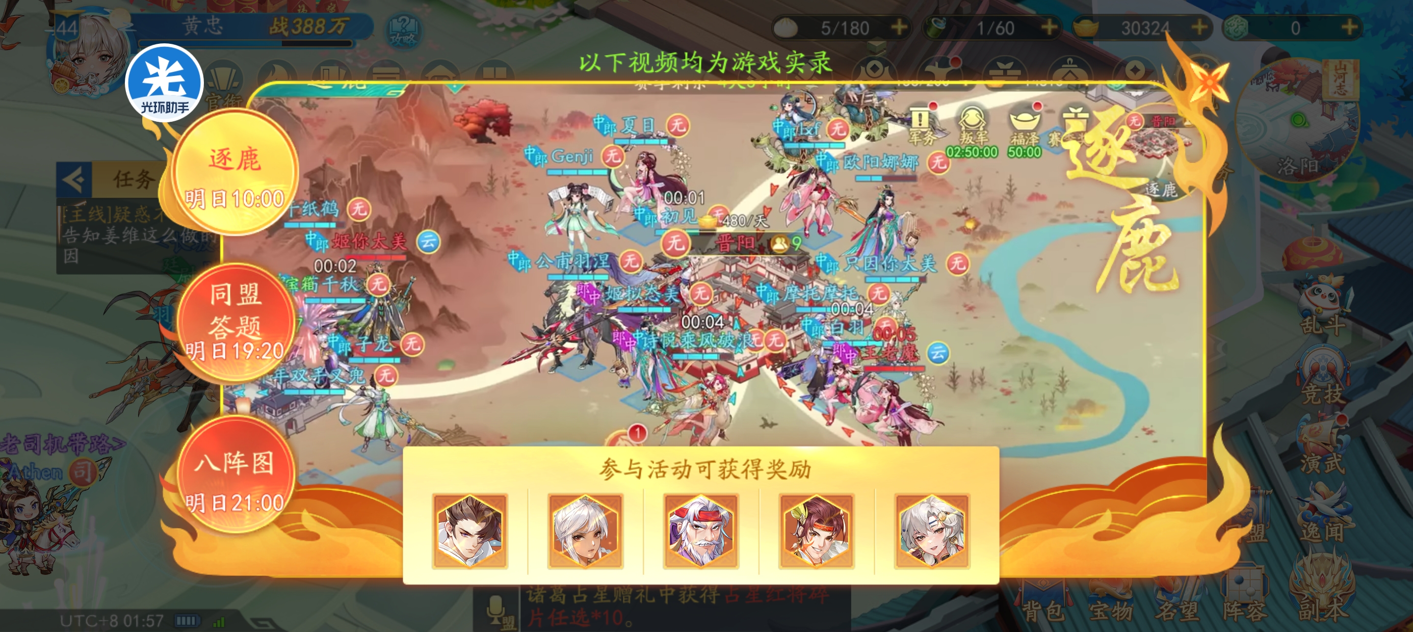 注意,逐鹿时间是明天上午10:00。推荐玩家随时把闹钟定定着。每日的活动时间不一样。到晚上7:20,答题时间到9点是八卦图活动。基本上每天活动有点贯穿一晚上。