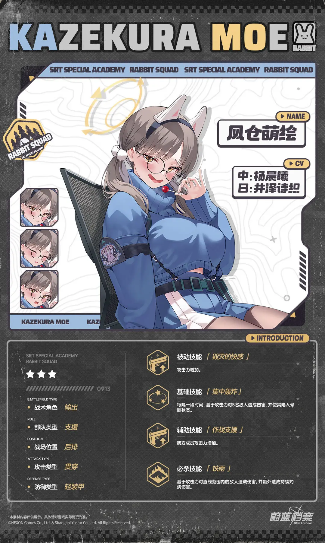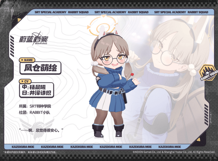 【人物档案】风仓萌绘光环资讯 - 二次元发布于 2024-03-31关注 //////////档案启封//////////■ 风仓萌绘SRT特种学院所属,RABBIT小队通信员,呼号【RABBIT 3】。憧憬着火力强大的武器,萌绘加入了SRT特种学院。但学院突然关闭后,她只好与小队成员一起在公园里风餐露宿。对爆炸与毁灭有着奇怪的兴趣,但支援能力却是毋庸置疑地优秀。重度依赖糖分,嘴里总是叼着棒棒糖。“怎么啦怎么啦~我好像闻到了危险的味道?”