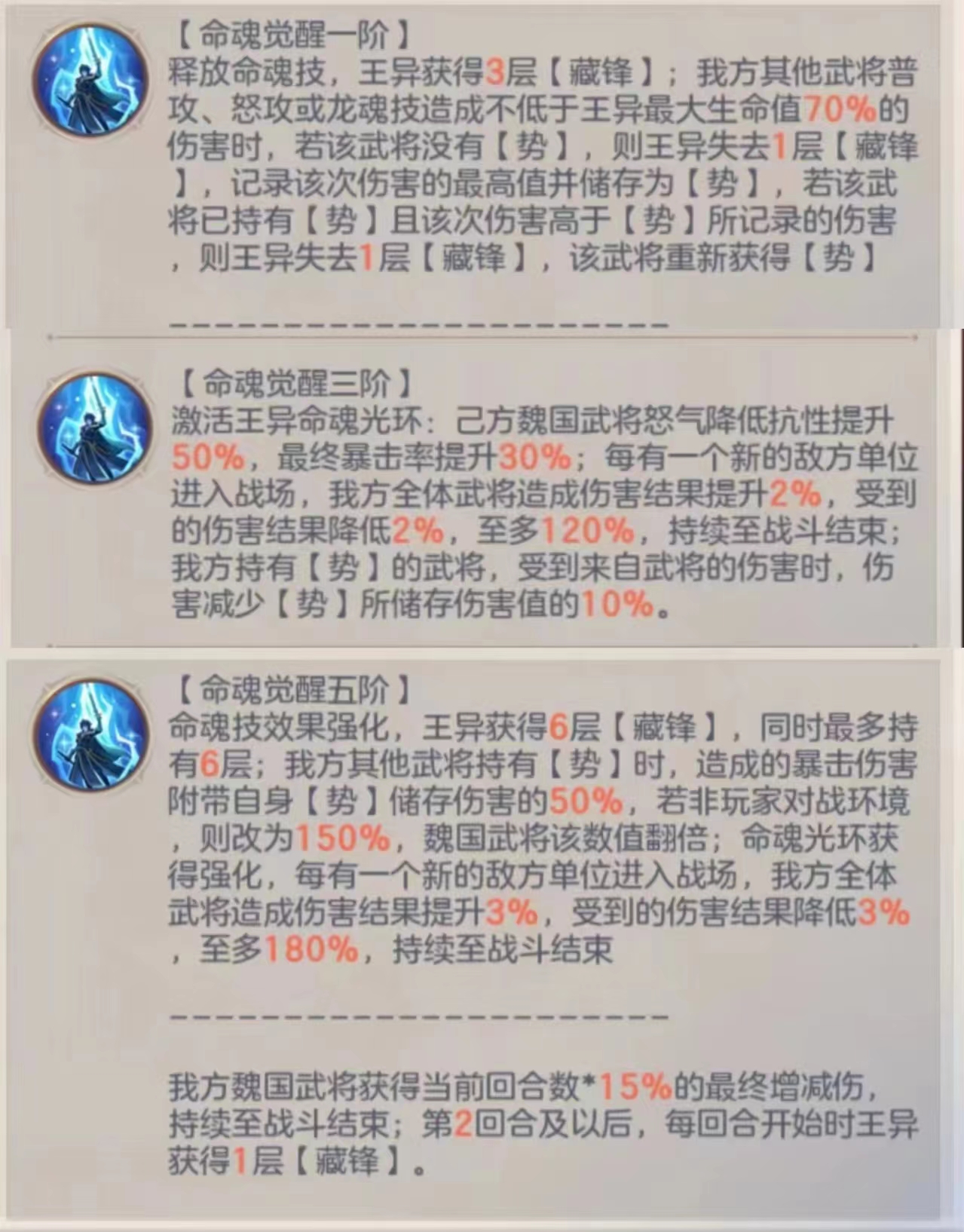 总结王异基本上与魏国、五子队死死的绑定在一起,完美适配于魏国阵容且更多可能就业于PVE刷分阵容,当然pVP也是可以选择,毕竟【势】也可以附加不菲的额外伤害