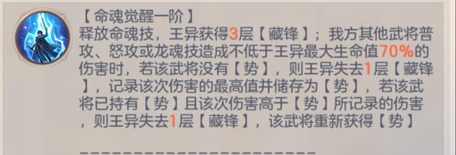 储存伤害触发条件具有不低门槛,要求队友需要具备高爆发输出,超过王异生命的70%,能够顺利获得【势】,且爆发输出越高,存储的【势】也将越高,附加伤害才会更高