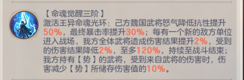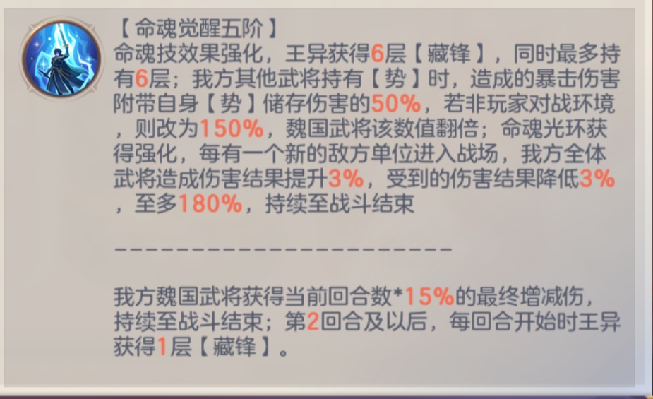 提升魏国武将输出能力,根据回合数提升最终增减伤,适合打持久战,且进一步提升获得【势】的稳定性