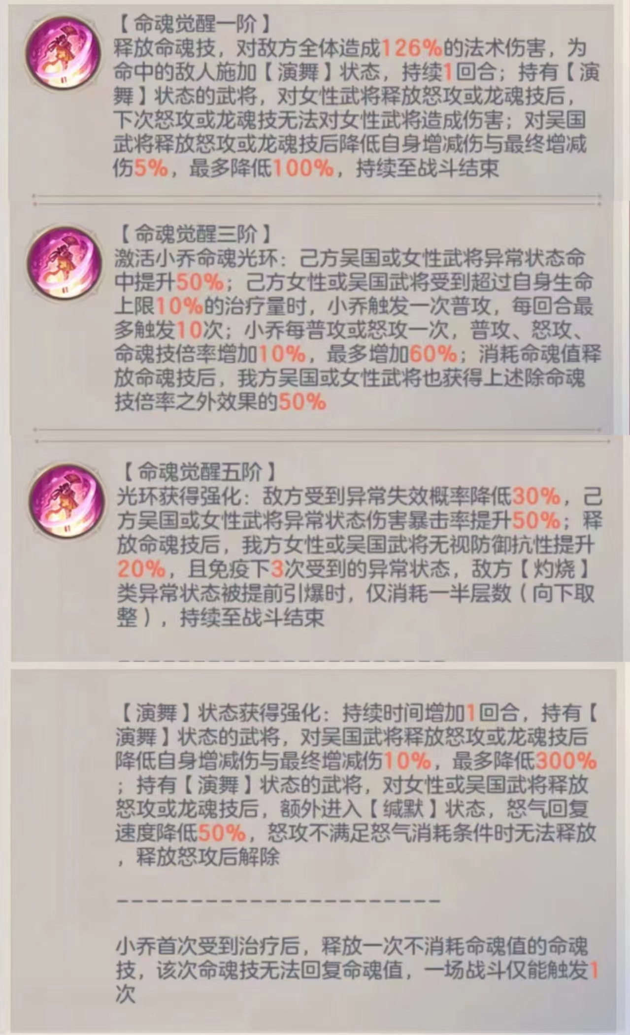 强化【演舞】效果,持续回合+1,减少小乔真空期,debuff附加增减伤和最终增减伤能力提升,每次降低10%,上限300%,且降低50%回怒速度