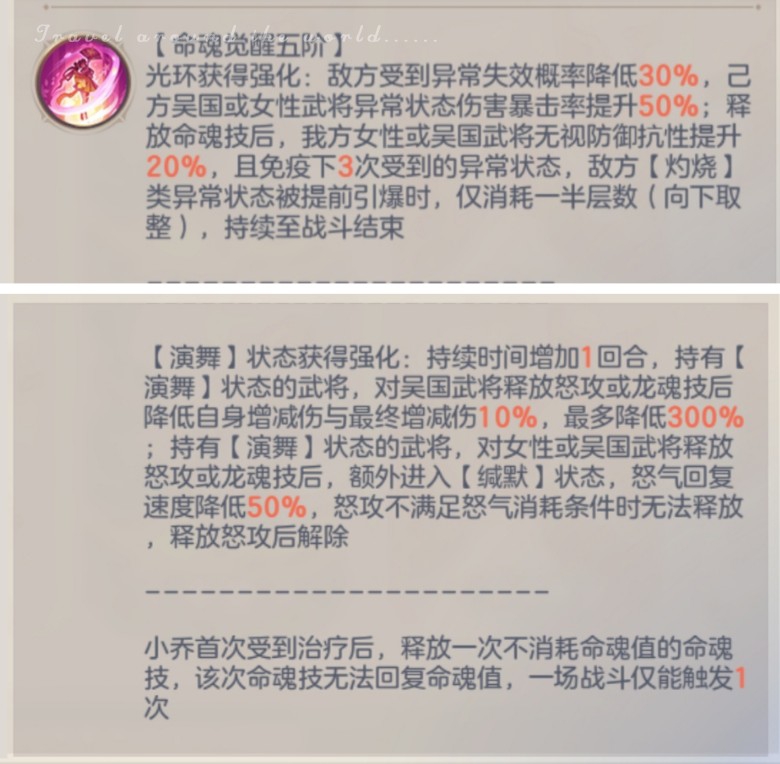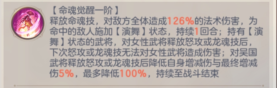 30%的普攻、怒攻、命魂技倍率增加附加到其他吴国和女性队友的身上,对所有的技能提升了伤害(除龙魂技外),是一个极其强大的群体增益技能和buff