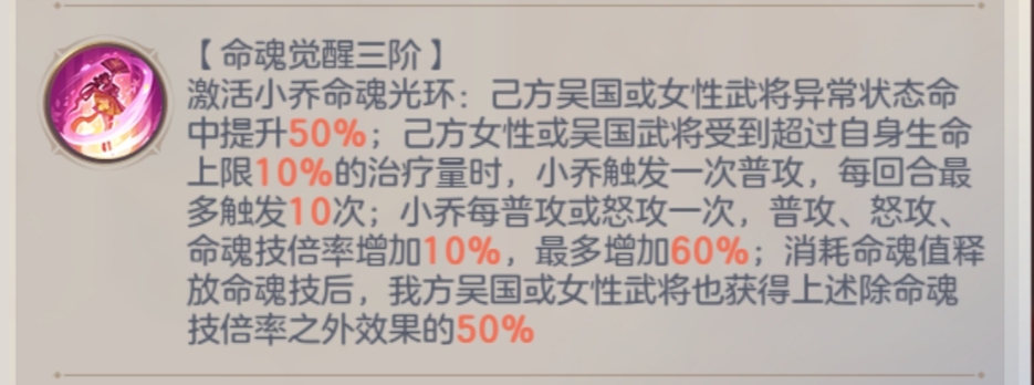 基于回血的追击普攻,吴国或女性武将获得超过生命上限10%的治疗量,小乔追击一次普攻,上限十次,每次普攻提升10%普攻、怒攻、命魂技倍数,上限60%