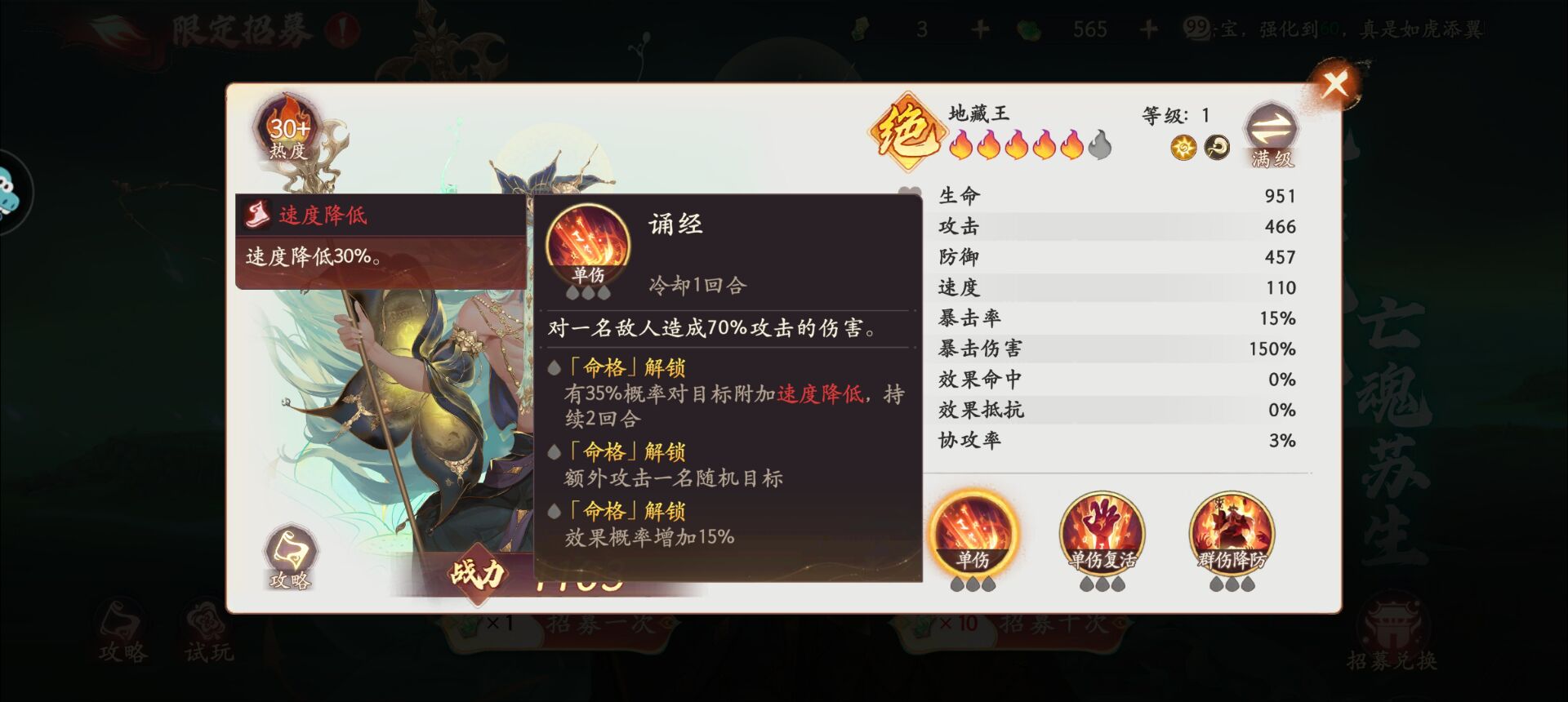 然后就是上面说的,地藏王如果抽不到3彩火,作用不大,就只能当当破防工具人了。而抽到3彩火对平民玩家不容易。