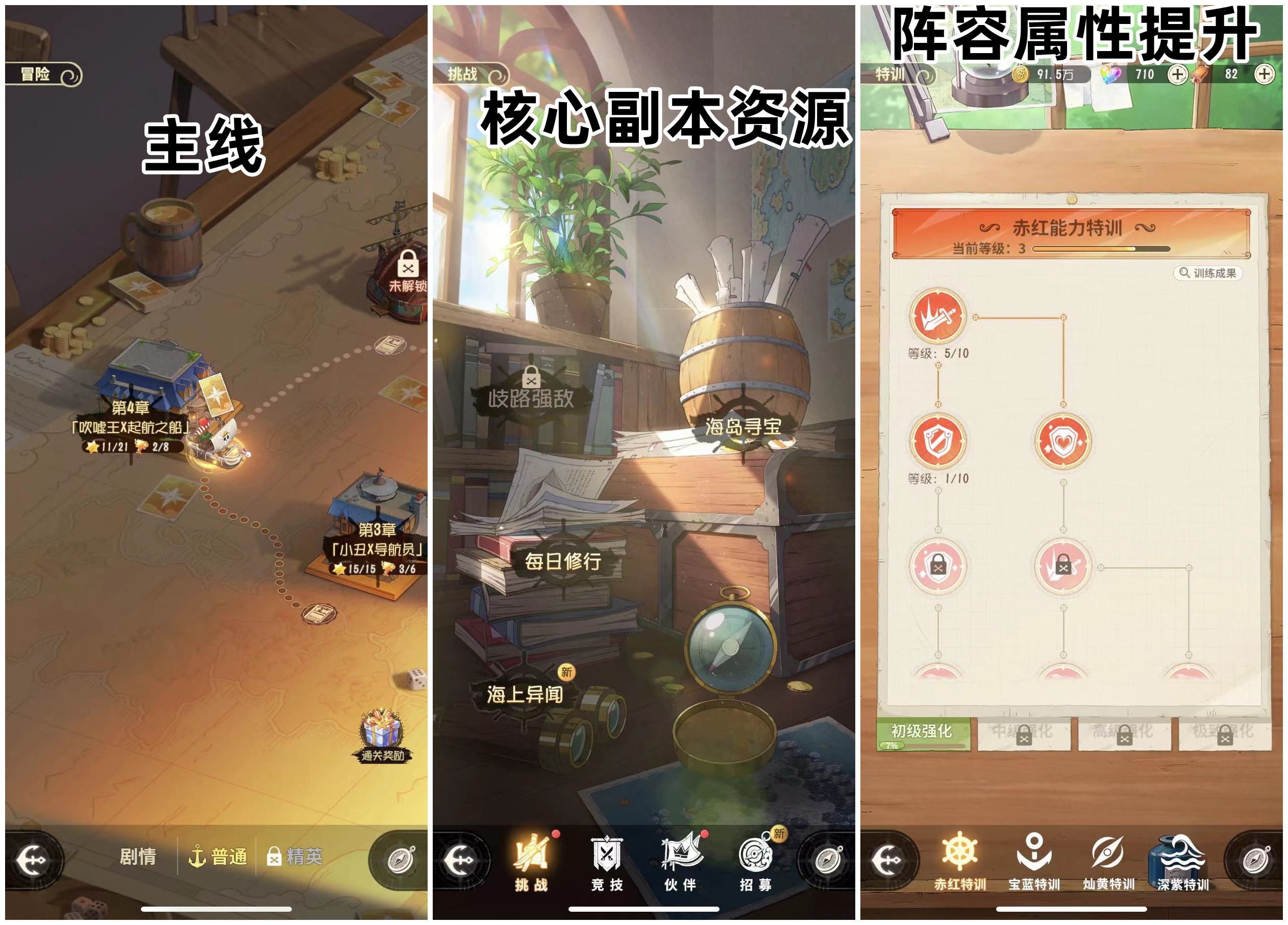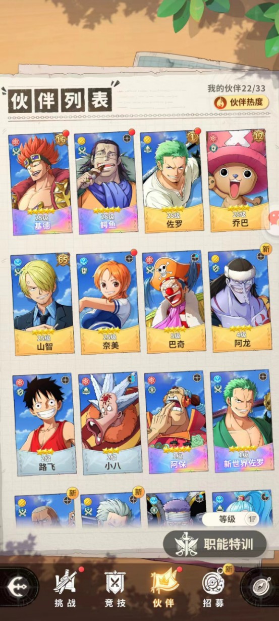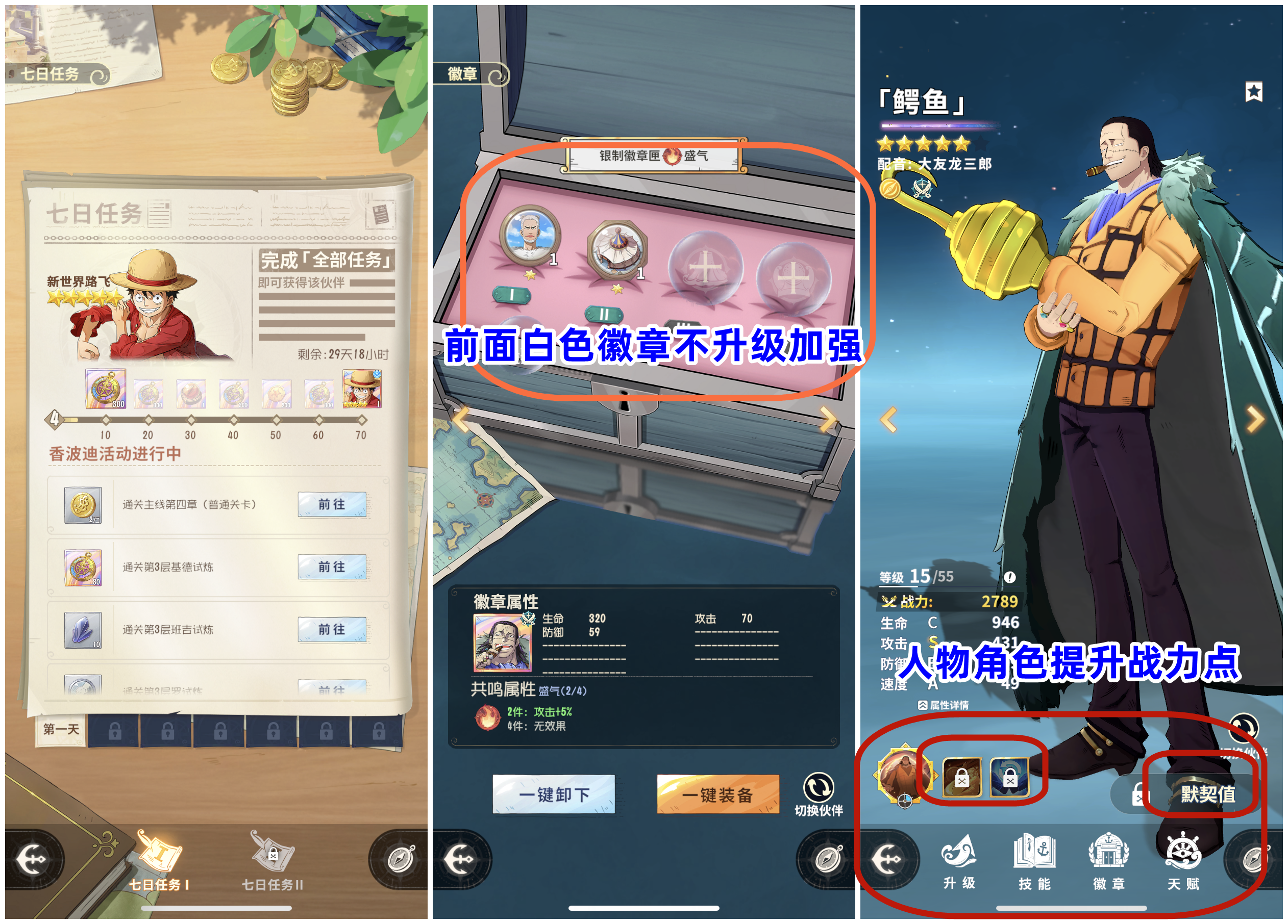 在游戏中,角色通过消耗体力进入打副本获得金币、(宝石、梦想指针,招募资源),通过7天签到活动,活动任务做完后,还能获得5星新世界路飞。活动奖励非常可观,前期培养人物可以考虑基德、艾斯、新世界索隆、班吉、老沙、罗、王女微微;老沙暂代替新世界路飞、艾斯代替山治。