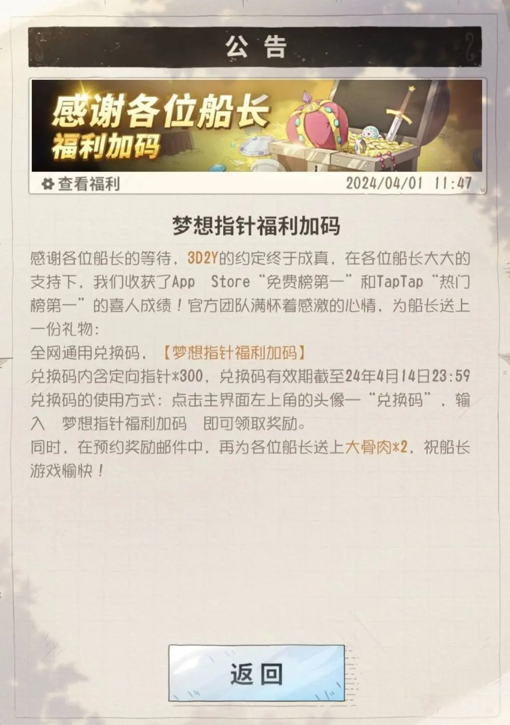 小芙真挚地感谢船长大大们的支持与喜爱。为此,小芙和项目组争取到了「定向十连抽」,给各位船长奉上作为谢礼!请船长及时进入游戏,输入兑换码【梦想指针福利加码】进行领取~
