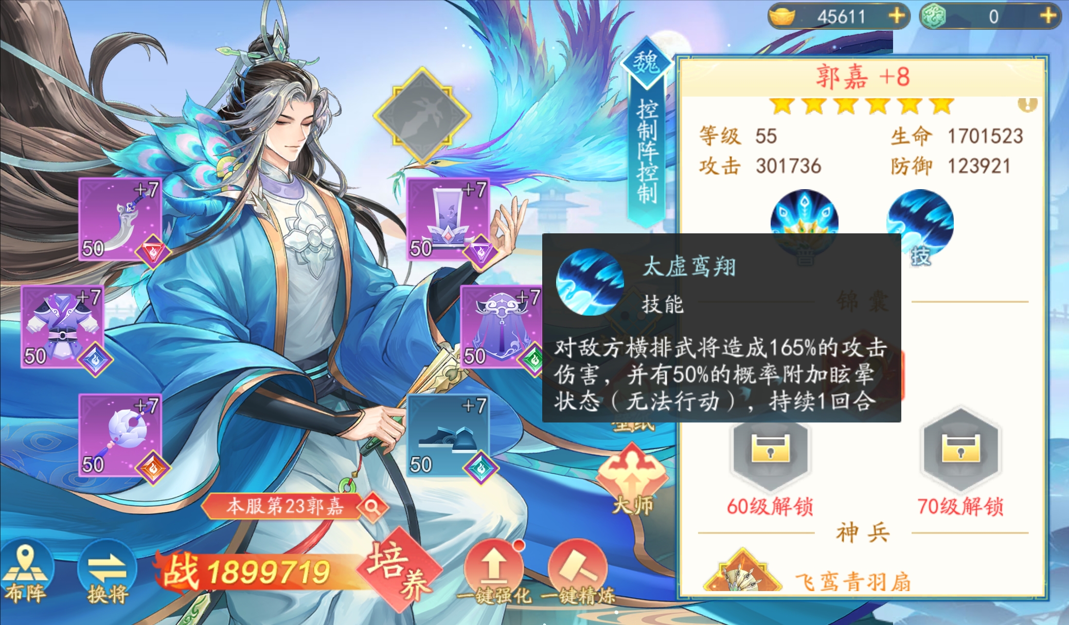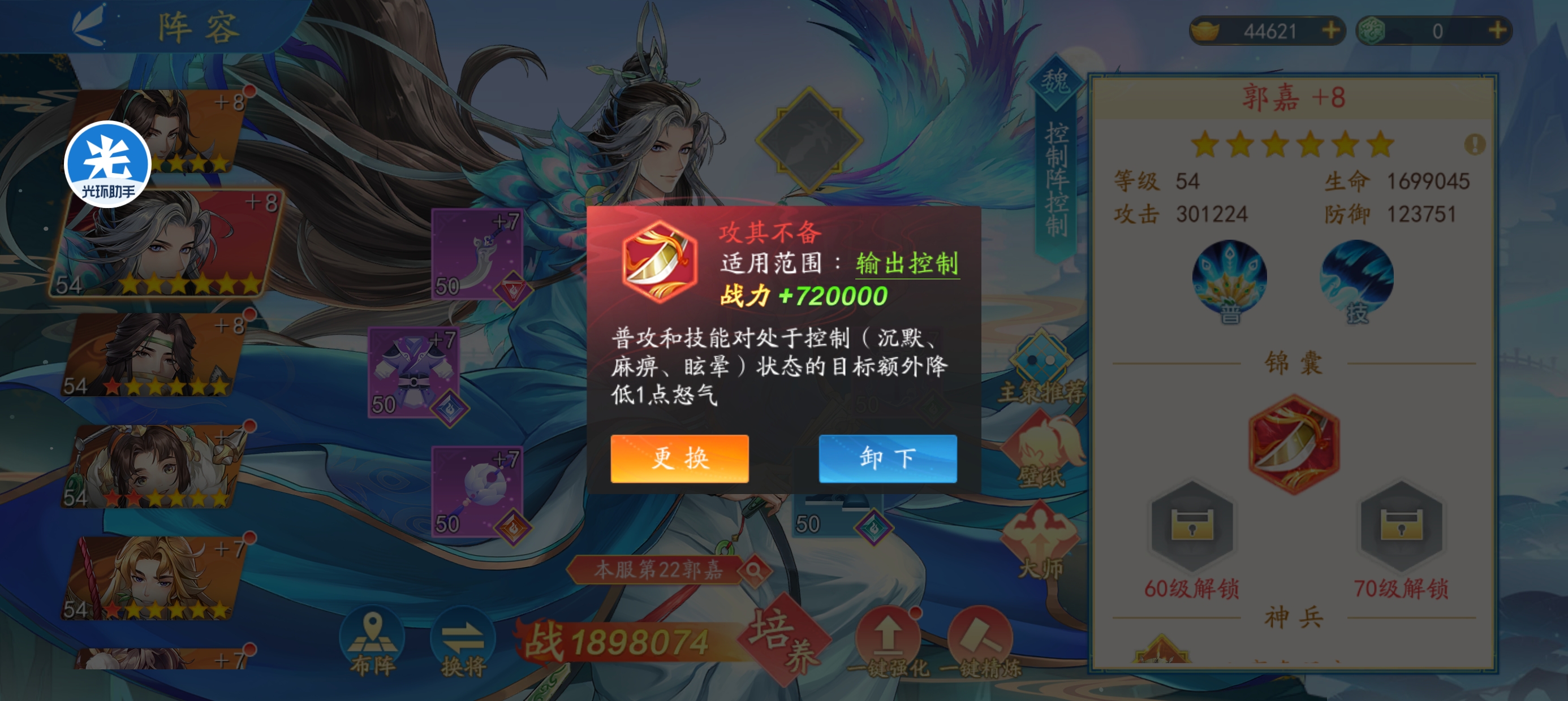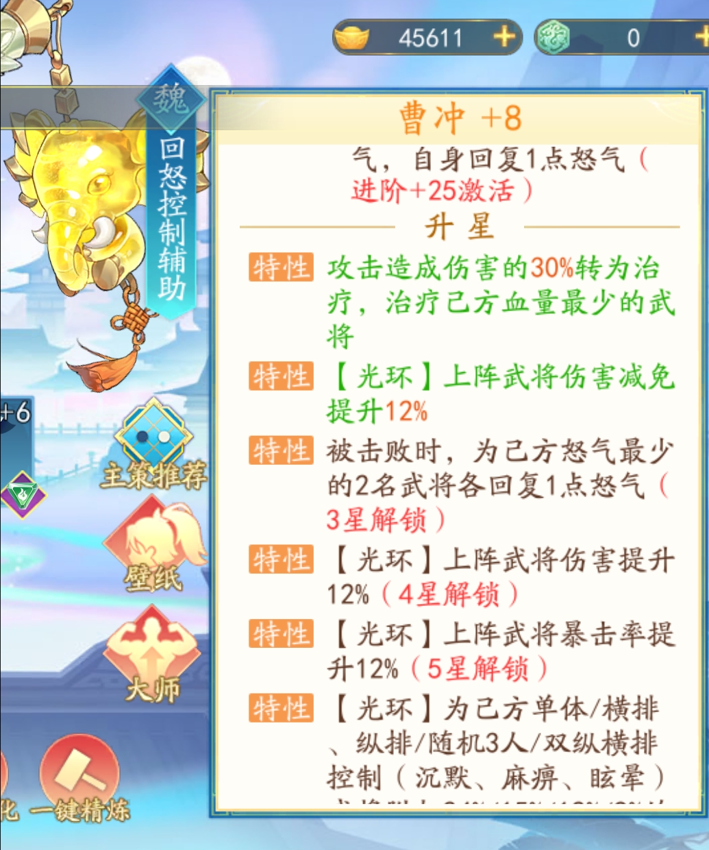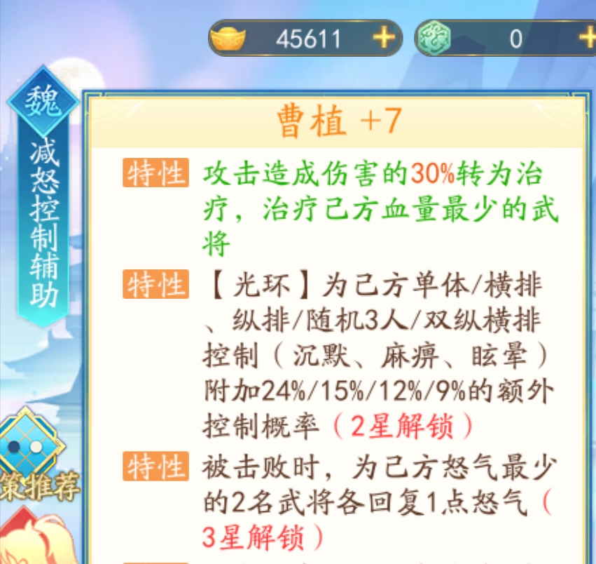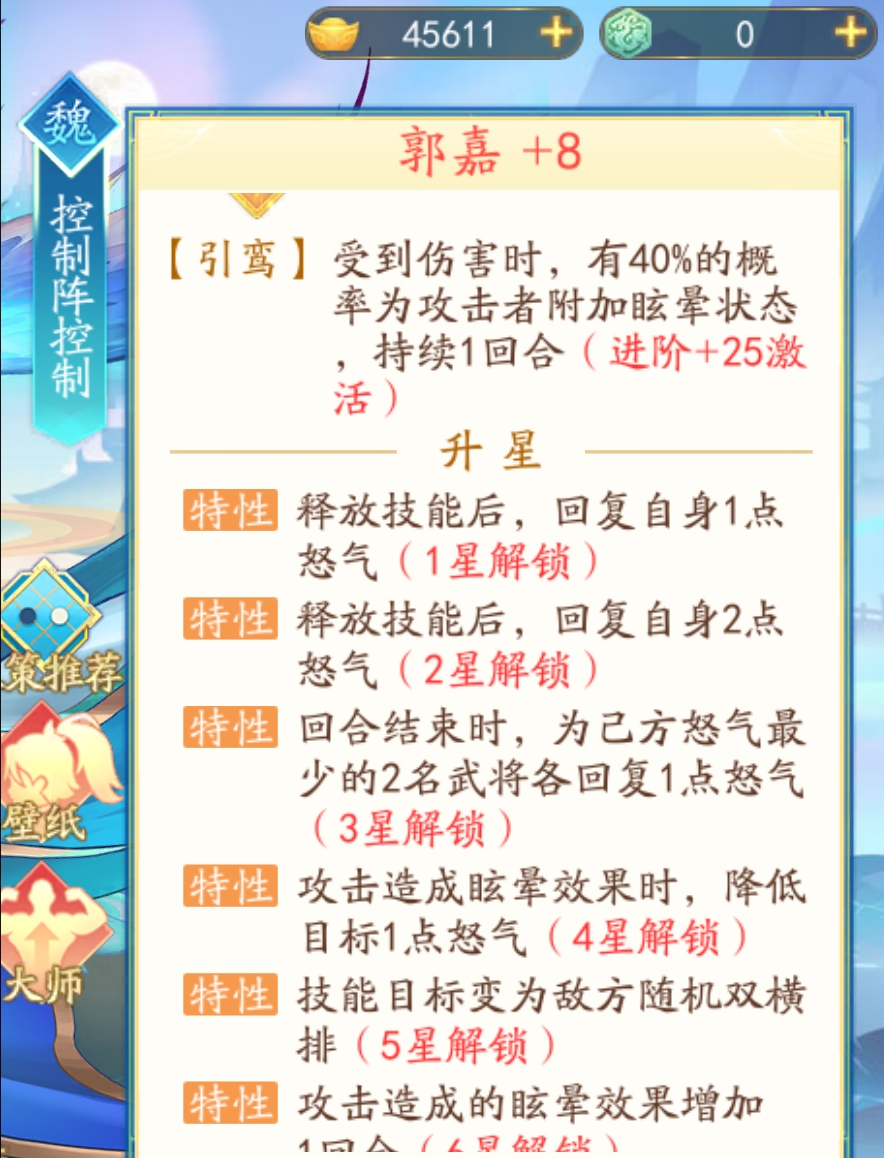 再携带【攻其不备】的话就会降低敌方2点怒气,五星的郭嘉会给敌方双横排进行眩晕减怒,让敌方做到有怒变无怒,一直普攻,大幅度削弱敌方整体阵容输出。