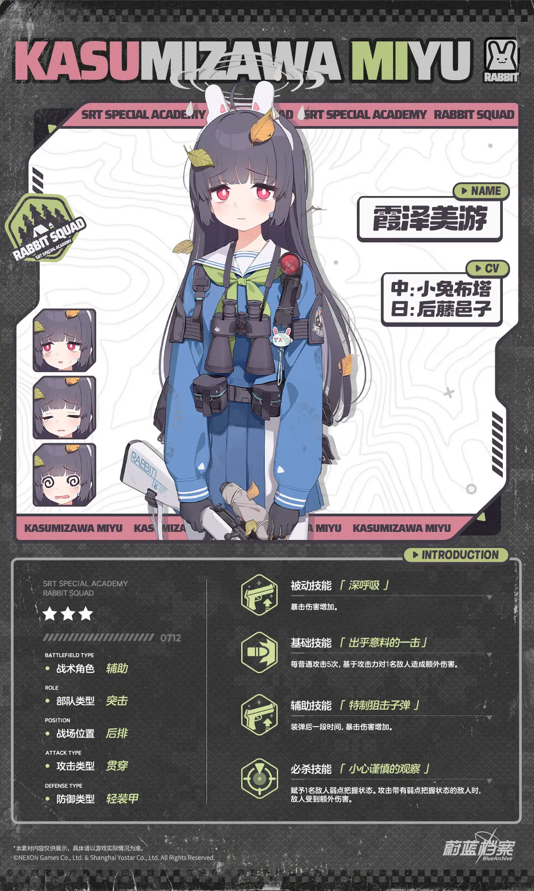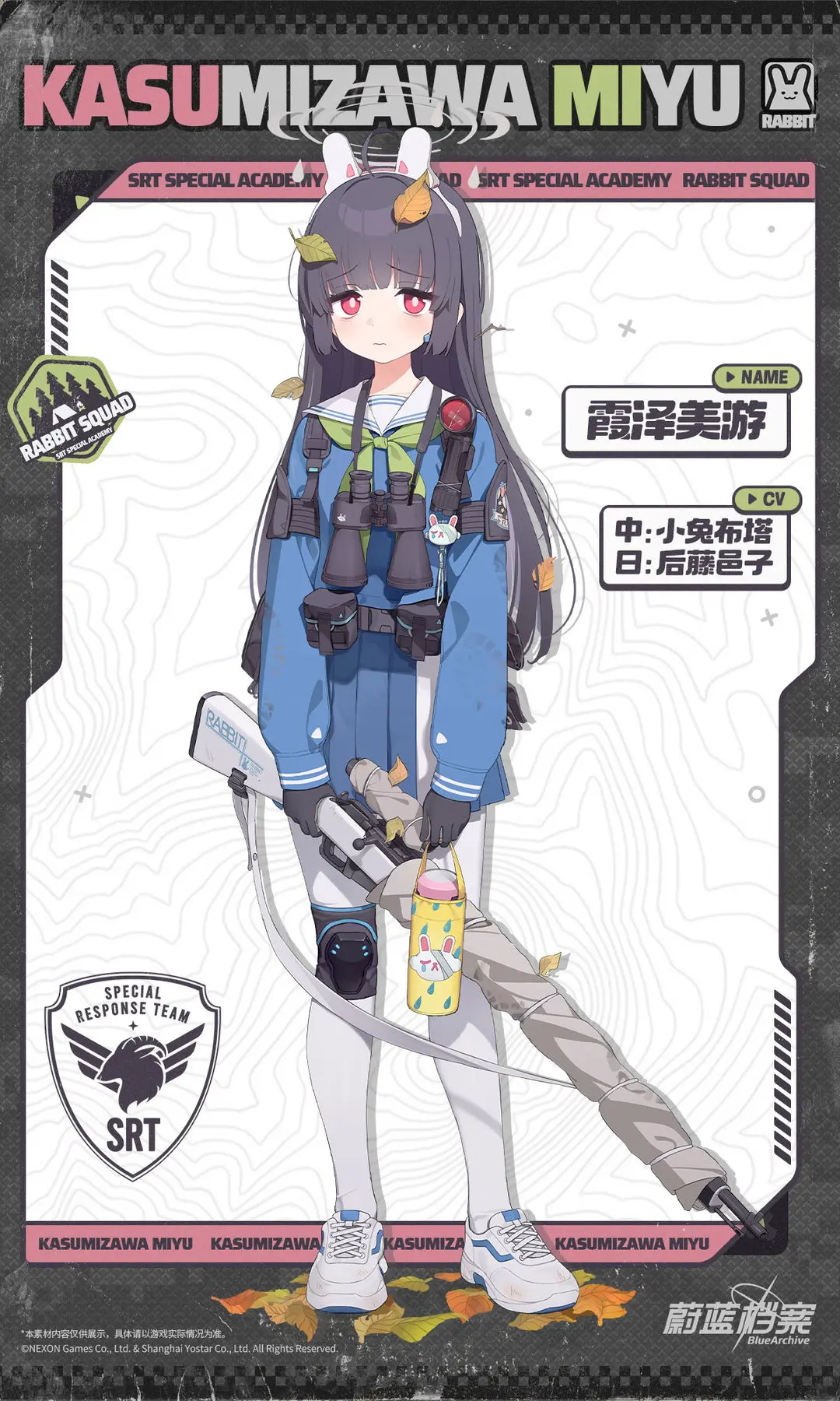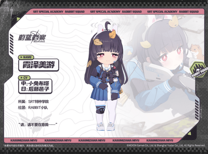 【人物档案】霞泽美游光环资讯 - 二次元发布于 2024-04-02关注 //////////档案启封//////////■ 霞泽美游SRT特种学院所属,RABBIT小队狙击手,呼号【RABBIT 4】。憧憬着活用与生俱来的狙击天赋,美游加入了SRT特种学院。但学院突然关闭后,她只好与小队成员一起在公园里风餐露宿。因为自身存在感很弱,所以很擅长执行狙击与潜伏任务。但有时不止是敌人,就连队友也会忘记她。“老师的指示真好呀……一点都不让人害怕……”
