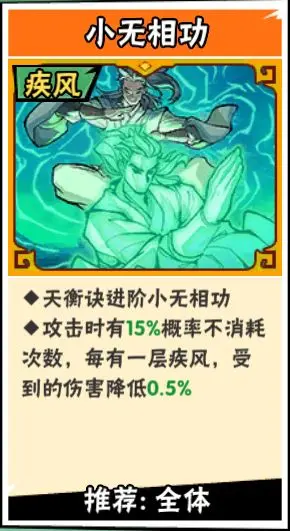 效果:攻击时有15%概率不消耗次数,每有一层疾风,受到伤害降低0.5%