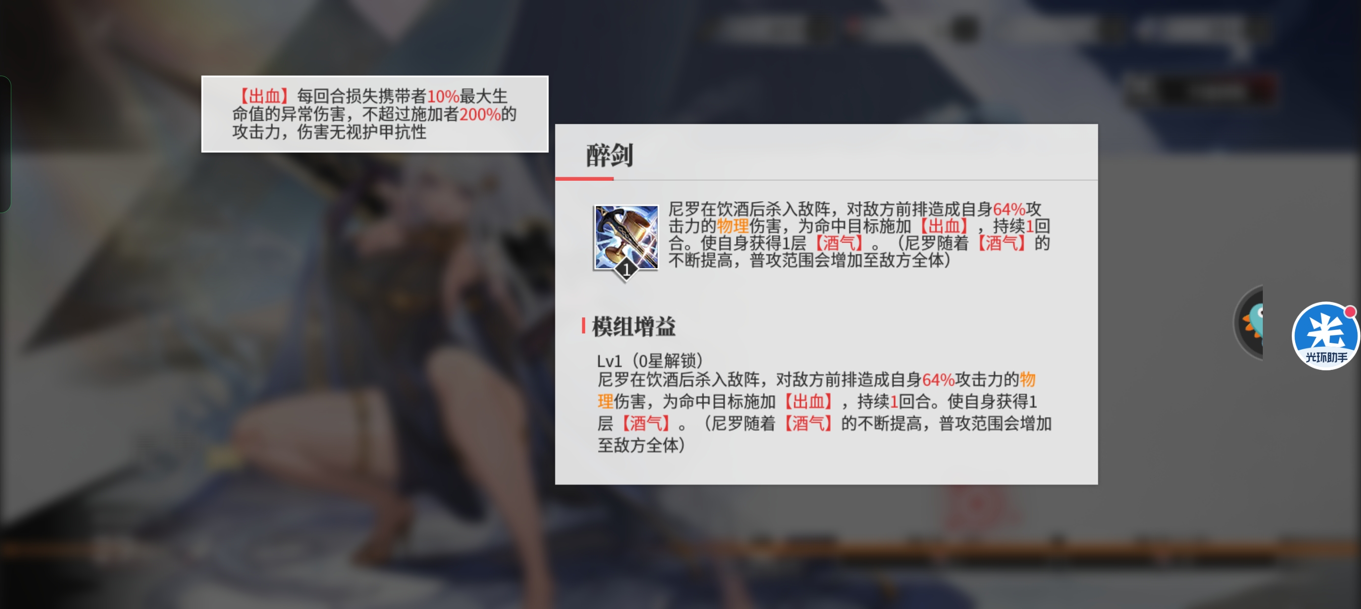 尼罗4星后1技能就可以满级,满级伤害从64%提升为77%。这个提升还是不大的,但是出血的回合数提升为3回合。