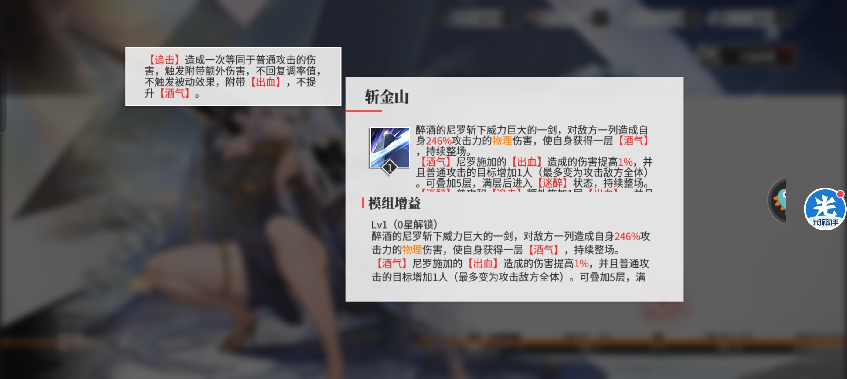 酒气会让出血伤害提升1%。同时让普攻攻击增加目标,一样都是让普攻最多变为全体目标。