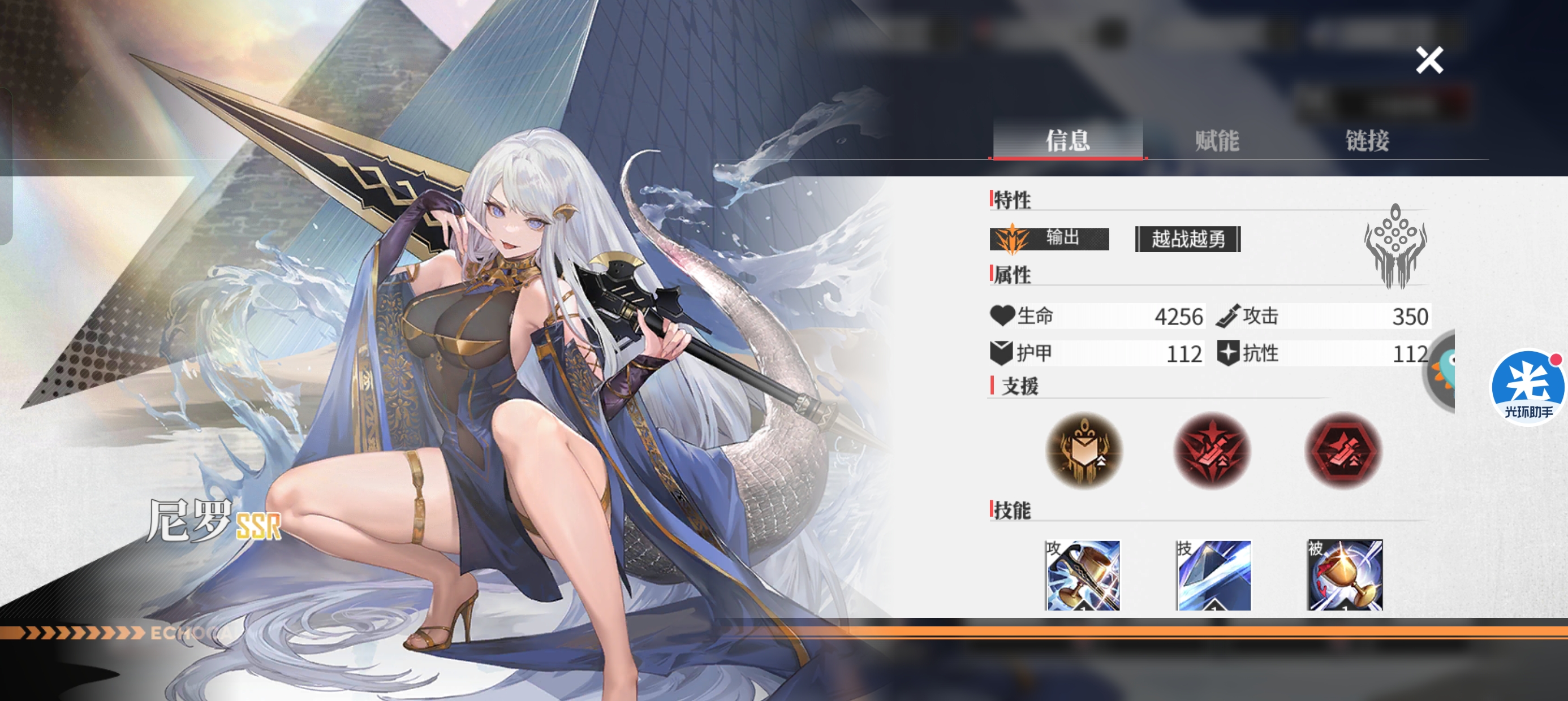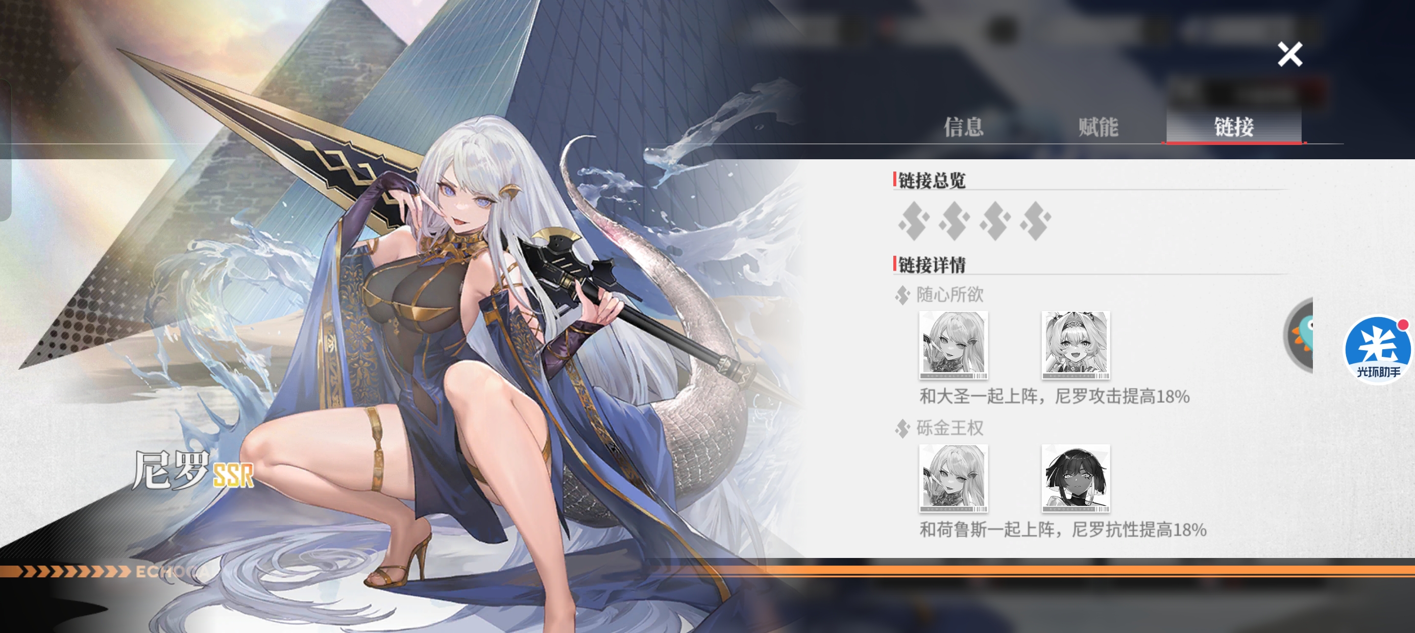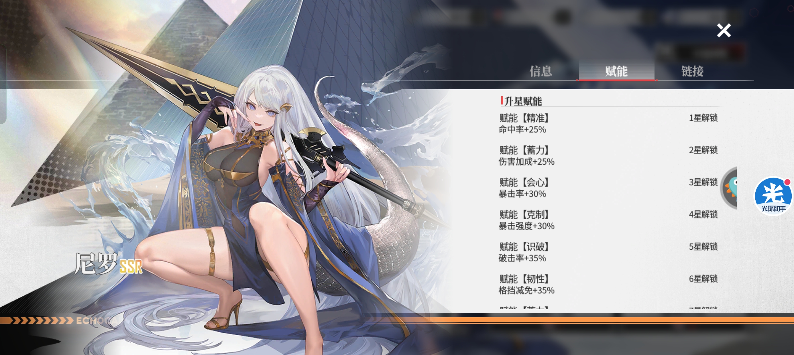 二:【尼罗】天赋和链接。不得不说尼罗的天赋是非常完美的:精准、蓄力、会心、克制、识破、韧性都是尼罗所需要的,有输出有生存。