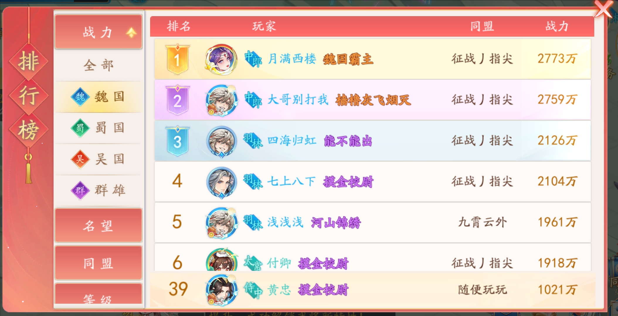 目前第五天战力来到了1021万,元宝约5.1万左右。魏国排名目前39。