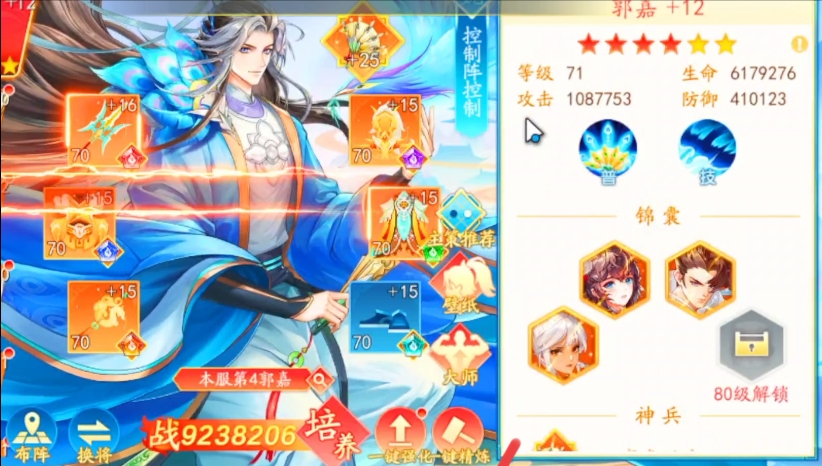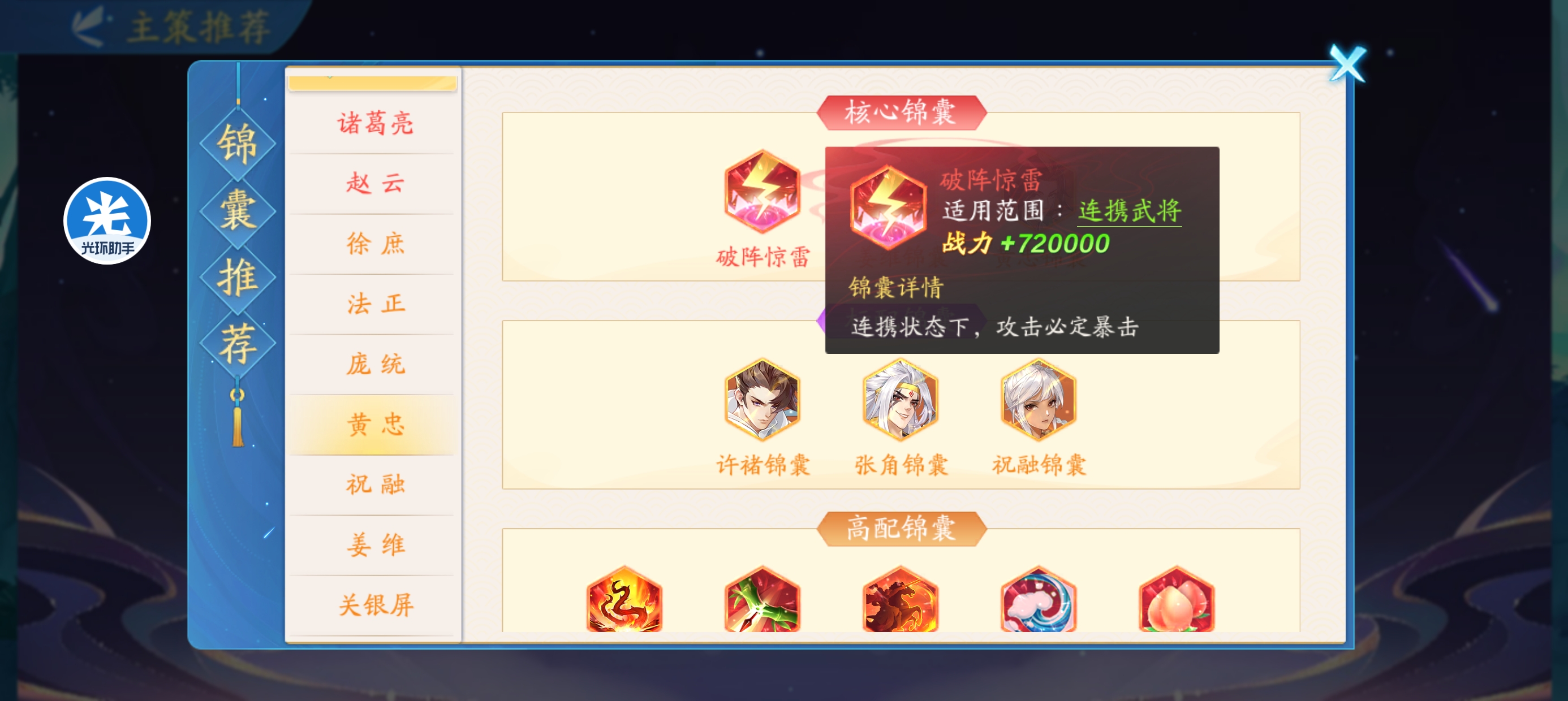 黄忠锦囊和郭嘉锦囊橙色搭配有点类似,基本上可以融汇贯通。也就是说只要做郭嘉的锦囊也就相当于制作了两个英雄的锦囊,我推荐优先凑齐郭嘉的锦囊,因为郭嘉是核心英雄之一。后期基本上难以被淘汰。这就是我为什么没有提前升黄忠的星级,因为后一周会大量出新英雄方便替换阵容。