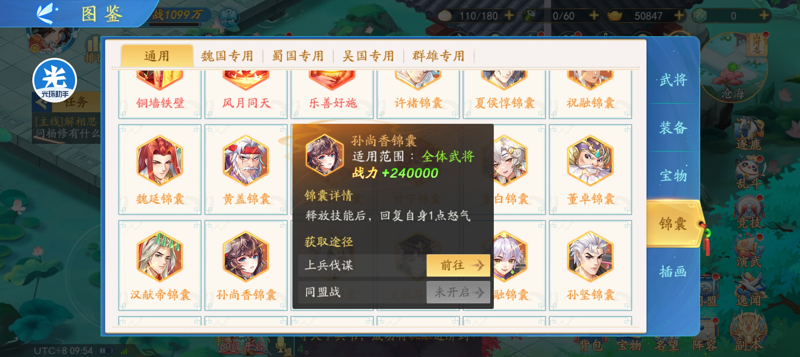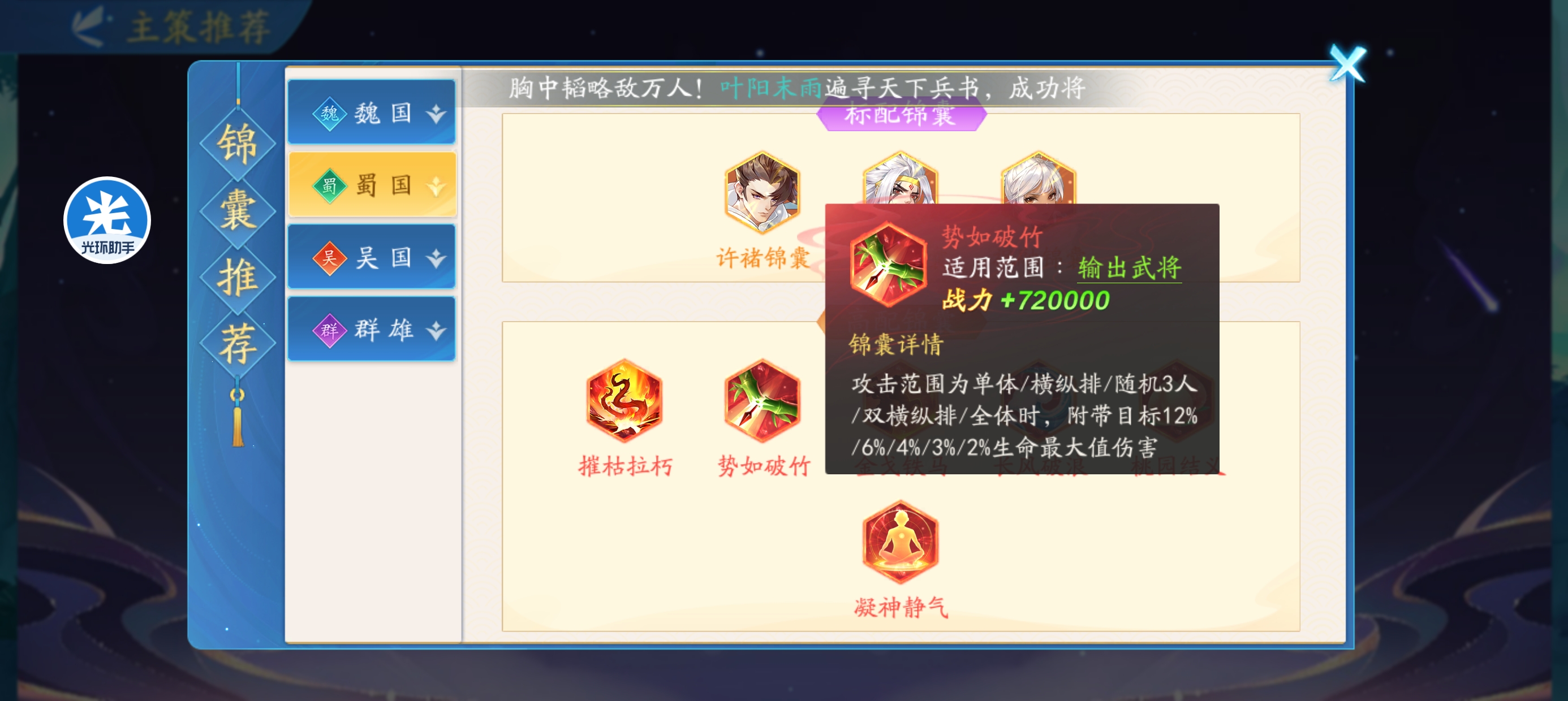 锦囊商店只能一周一周的存,存到3万就可以购买一次永久的橙色锦囊,锦囊是这游戏的核心玩法。每张卡都有相对应的技能搭配,搭配好了可以形成与主c和辅助的衔接,贯穿伤害,以策略致胜。以下介绍一下郭嘉核心英雄的锦囊推荐搭配。