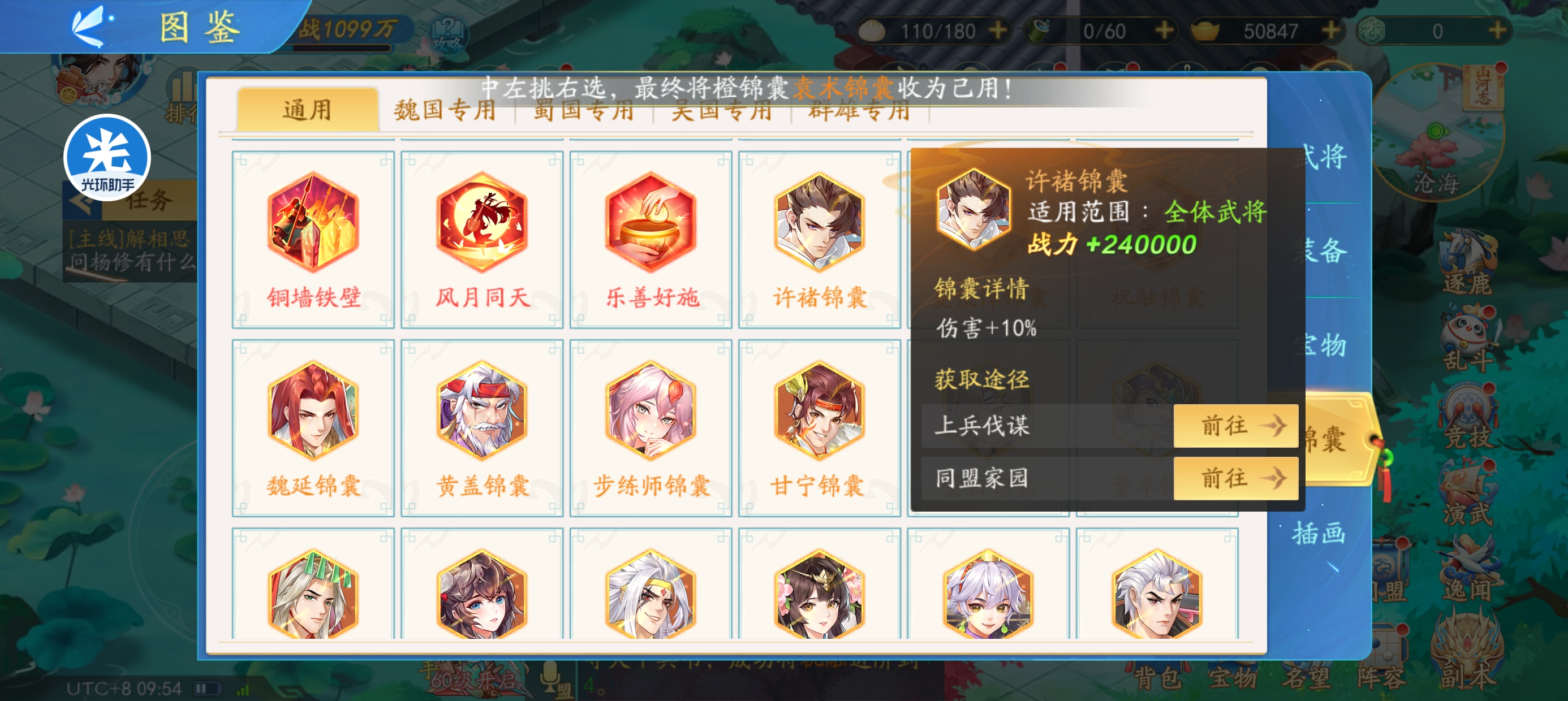 这里选择的是许诸锦囊,有的人问郭嘉是一个控制辅助英雄,为什么还会带伤害类的锦囊?可以从阵容的角度来分析,目前输出,只有黄忠会感觉比较单调以及输出衔接的不够完美,就是不能够快速的形成击杀,如果后期在郭嘉达到五星的时候攻击双横排敌方时,如果伤害足够高就可以秒掉敌方的后排无限的释放大招就无限的控制敌方。携带基础伤害锦囊+阵容光环效果。基本上两三个大招回合下来,敌方后排辅助就已经消失。