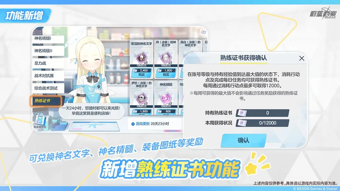 • 在账号等级与持有经验值到达最大值的状态下,消耗行动点则会以1:1的比例获得“熟练证书”