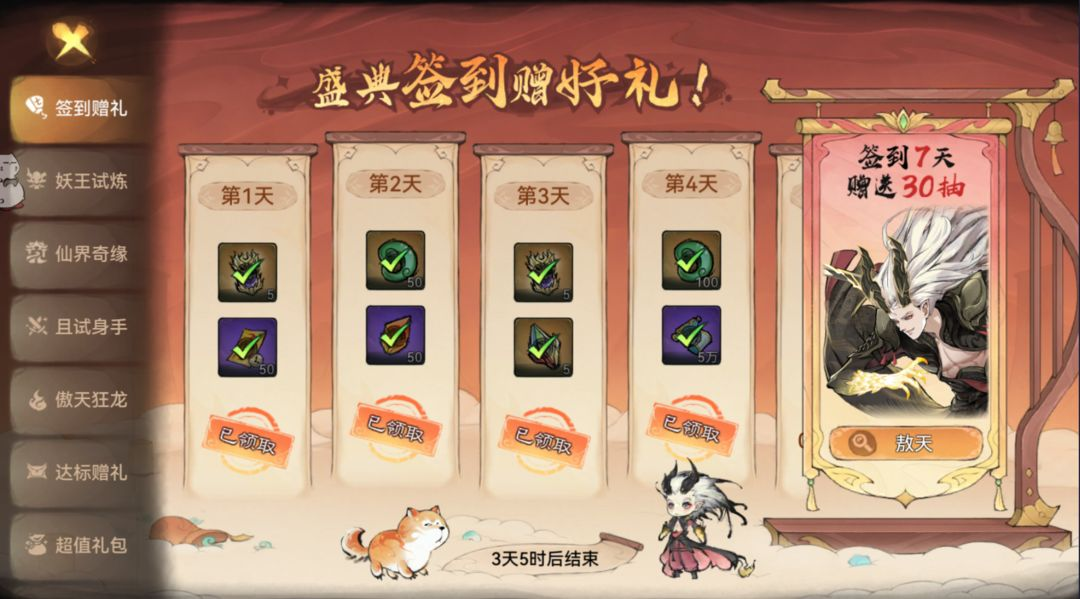 妖王试炼活动伤害累计达标就能领取奖励,7天7个boss,合计可得70仙缘令,加上签到的30仙缘令刚好一百抽,足够普通玩家白嫖一个本体了。