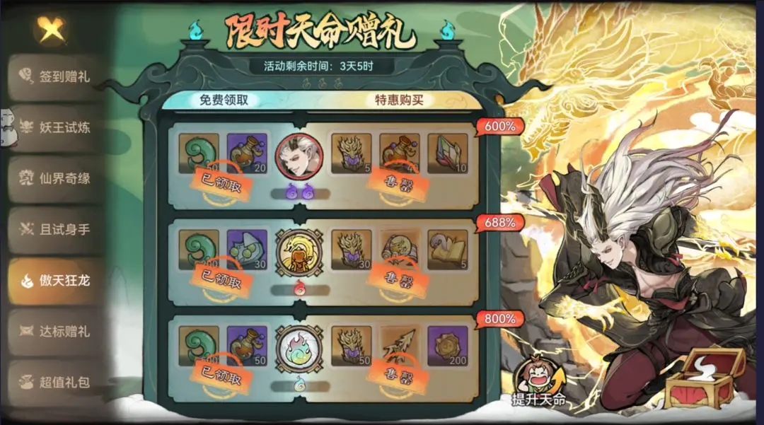 活动就介绍到这里了,这里贫道想给玩敖天的道友们一些忠告吧,想玩敖天就多买点每日每周的混沌灵魄礼包吧,抽到敖天本体后用混沌碎片拉天命,达到红一或者仙一再买道兵功法,这样会比道友们纯靠仙缘令抽取要划算的多。六选一啊六选一,怨念中。。。普通玩家看看就好,白嫖一个本体就赚了,游戏后面有更多玩法和新弟子在开放,咱们主打一个白嫖就好了。