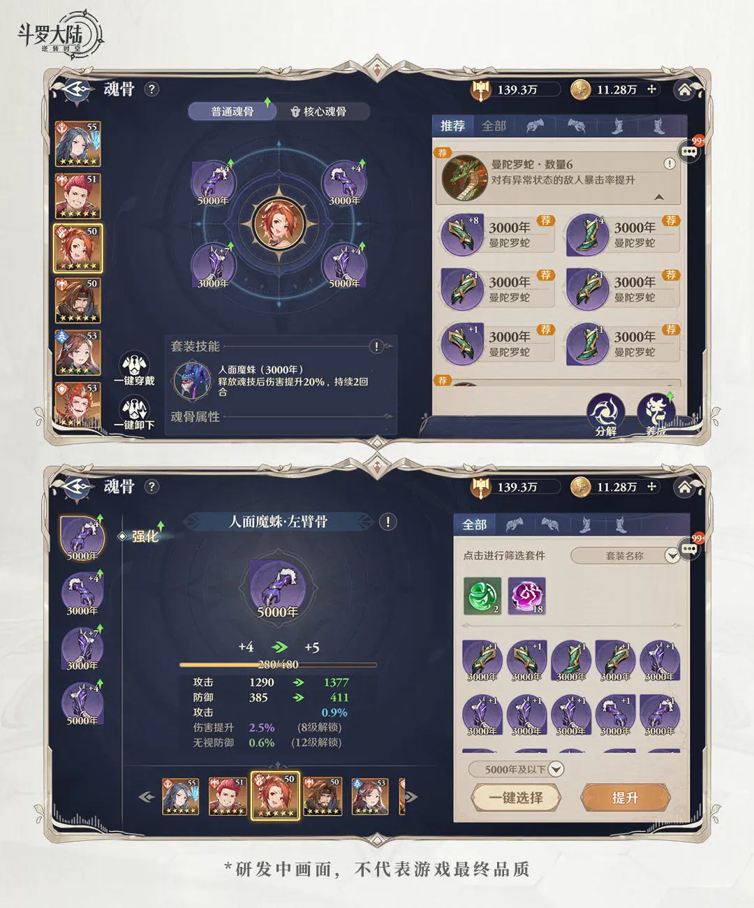 6、魂师魂骨:每个魂师可以装备6件魂骨,给魂骨升级一样可以提升较高的战力。需要注意的是,魂骨要成套搭配,战力加成更高。魂骨年限越高,战力加成越高。