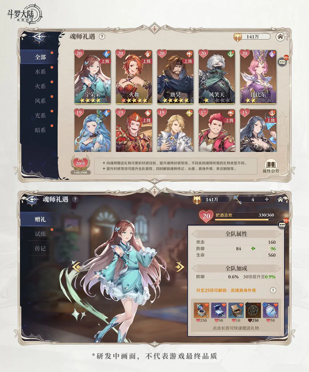 2、提升魂师好感等级可解锁魂师传记、魂师头像等多种奖励。好感度提升后还能给全队增加战力。