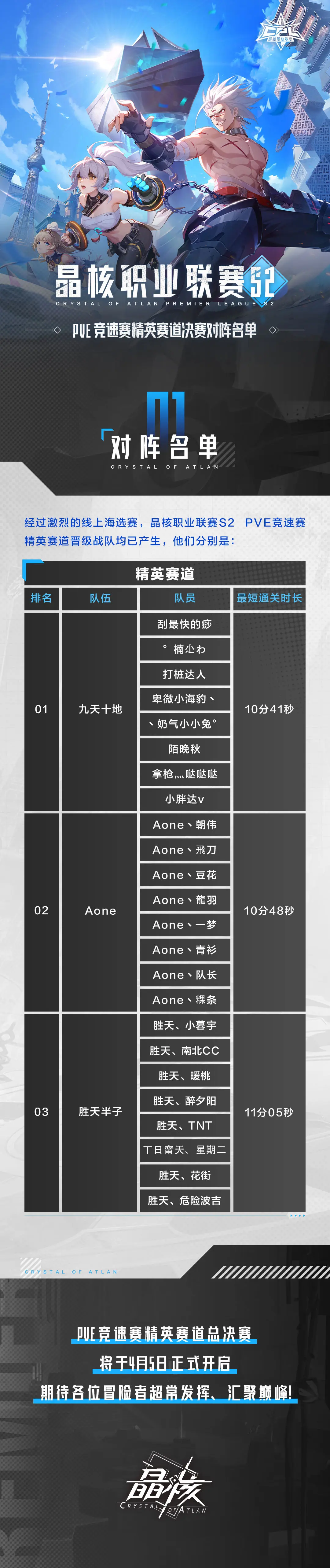 晶核职业联赛S2丨PVE竞速赛精英赛道决赛对阵名单公示 今晚开打!光环资讯 - 综合发布于 2024-04-05关注经过为期一周激烈的线上海选赛,晶核职业联赛S2 PVE竞速赛精英赛道晋级战队已产生!冒险者可戳长图查看具体晋级名单~PVE竞速赛传奇&精英赛道总决赛将于4月5-6日正式开启。4月5日晚18点至21点,锁定游戏内或各大直播平台官方直播间,获取观赛福利、见证精英赛道冠军诞生!期待各位冒险者超常发挥、汇聚巅峰!