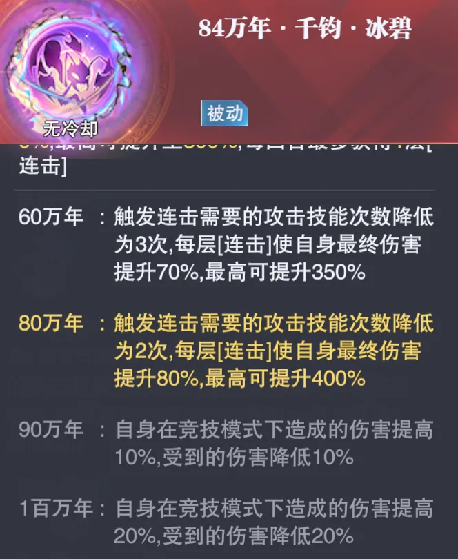 例如之前的【千钧冰碧】这个百万年凶兽魂环,其PVE的封顶效果就是80万年,而90万年和100万年则是PVP的专属效果。