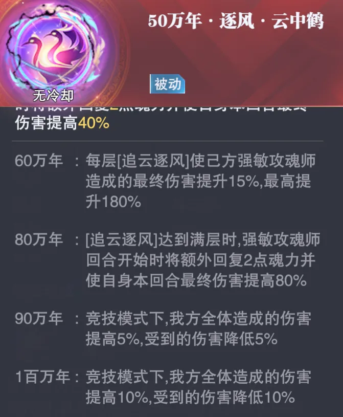 而第二百万年魂环【逐风云中鹤】其实也是类似的设计逻辑,其PVE的封顶效果亦是设定在了80万年,而90万年和100万年的效果则是属于PVP的专属效果,包括第三个百万年魂环【天星幻瞳蛇】其实也是类似的设计逻辑,那例如这样的设计思路其实就是让对PVP有排名追求的大佬玩家可以去冲击90万年或100万年的效果,而大部分玩PVE的普通玩家则无需去冲90万年或100万年的超高成本效果了。