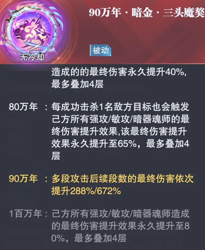但是当百万年凶兽来到了第四个【暗金三头獒】和第五个【擎风魔树】后,其设计思路就出现了类似于刚刚我们提到的魂师方面的改进,说白了就是90万年和100万年也开始设计成了PVE的效果,且90万年这个门槛所涉及的质变提升也会处于一个较高的幅度,这无疑也是将针对大部分玩家都要玩的PVE门槛提到了一个更高的幅度,从而去刺激大家的培养压力和成本投入,策划也希望这点能变相成为刺激流水的一个X因素。