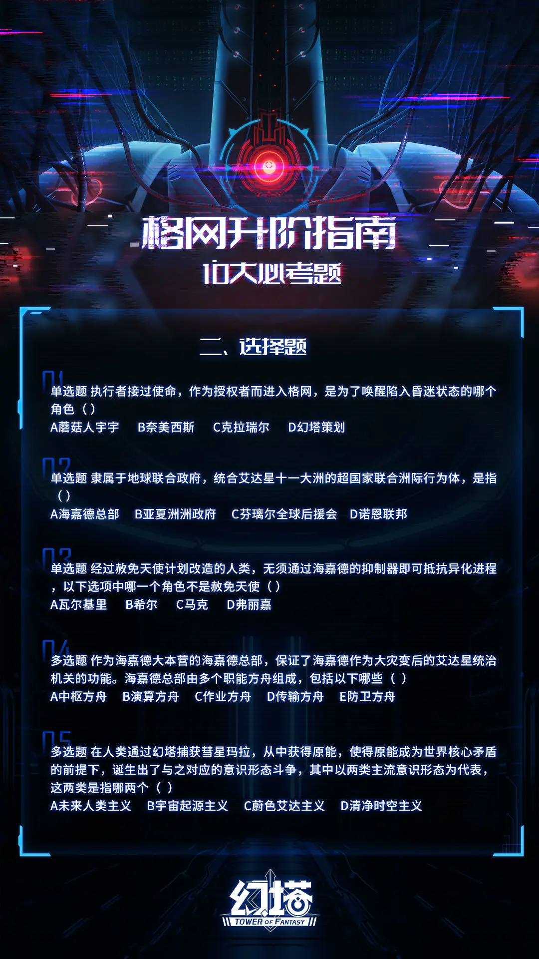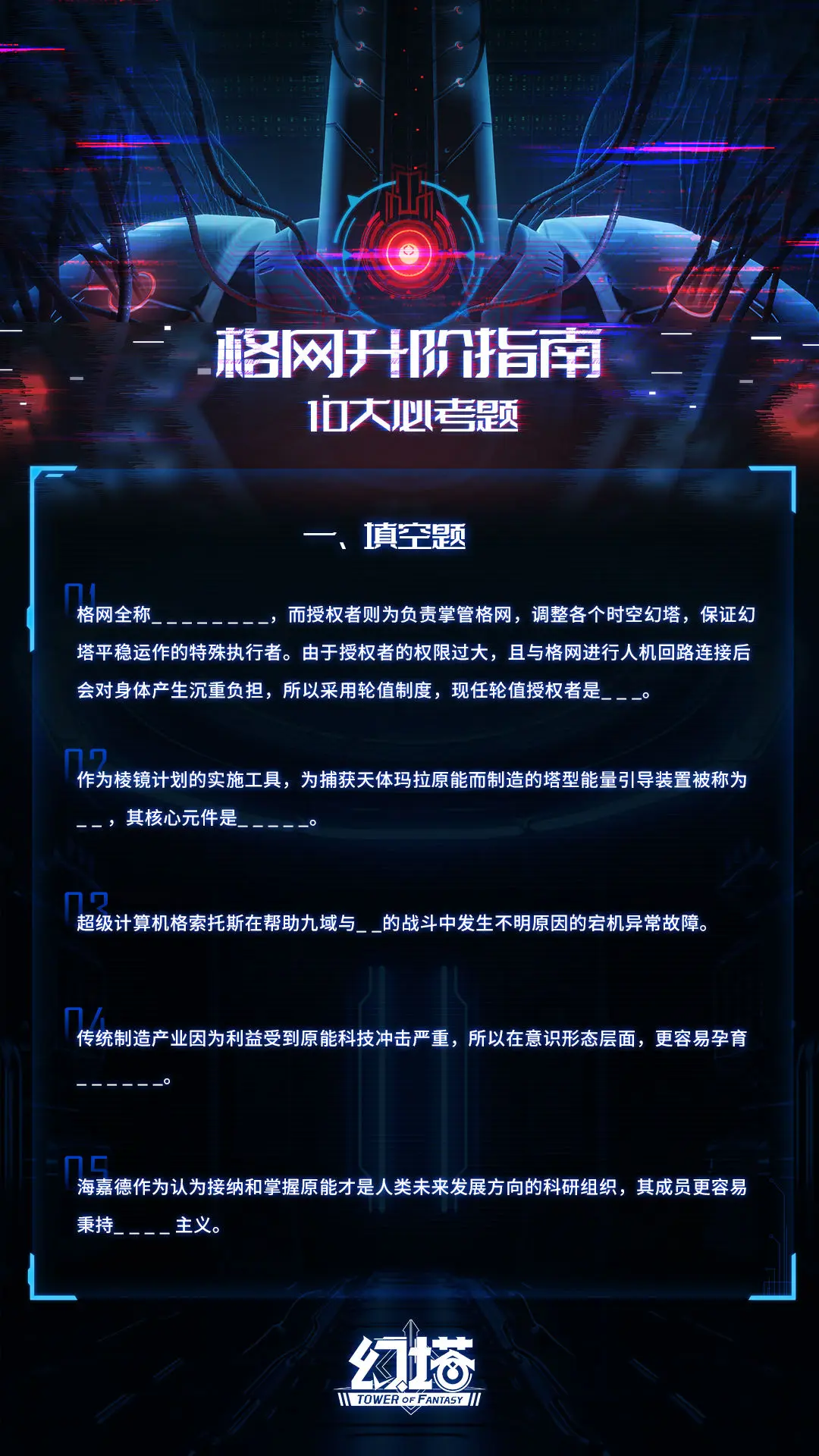 《幻塔》格网升阶指南-测试篇幻塔 - 新闻星发布于 2024-04-07关注为迎接即将到来的格网世界,第一届(极有可能也是最后一届)的授权者浓度测试现在开始!各位执行者请即刻前往“先遣考场”,认真读题,并进行填空与选择。最后,一位塔姓伟人曾说过:虚拟世界是一场对现实的浪漫逃亡,在格索托斯复原的虚拟世界里,新的冒险即将启程,执行者记得来赴四月之约!