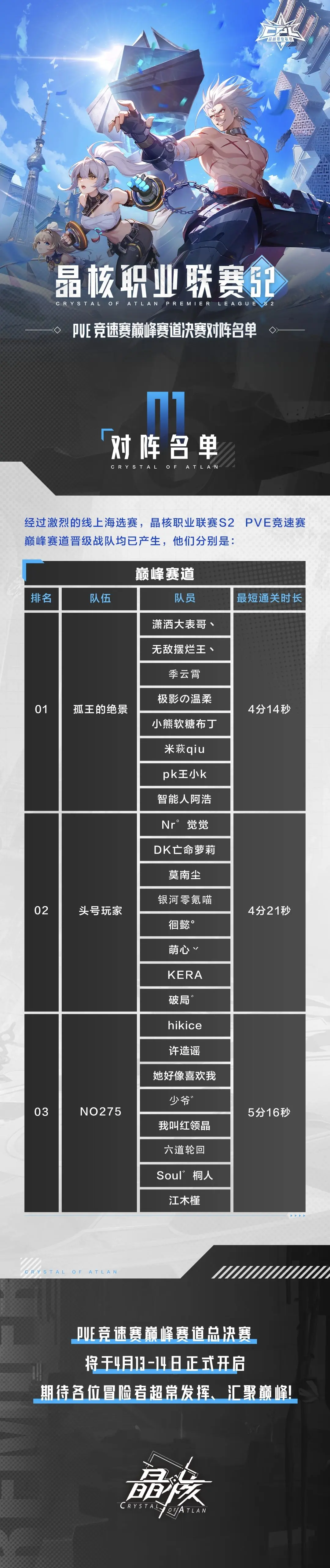 晶核职业联赛S2丨顶峰相见!PVE竞速赛巅峰赛道决赛对阵名单公示光环资讯 - 综合发布于 2024-04-09关注经过激烈的线上海选赛,晶核职业联赛S2 PVE竞速赛巅峰赛道晋级战队已产生。PVE竞速赛巅峰赛道总决赛将于4月13-14日开启,小兔与猫哥邀你一起见证冠军诞生!同时,猫哥将在现场为冒险者们带来《晶核》未来半年版本爆料,敬请期待~