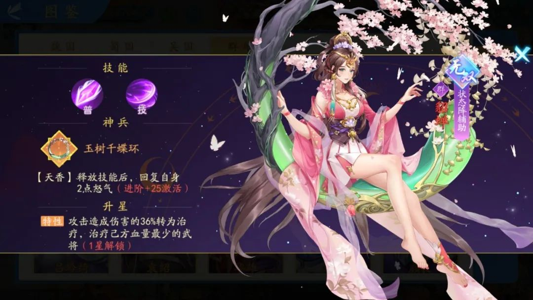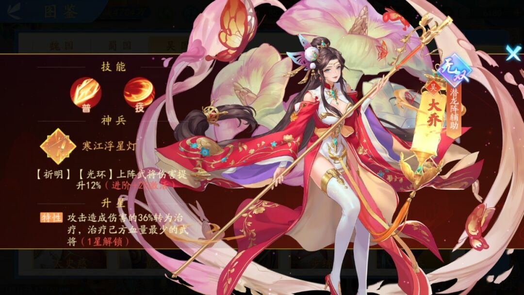 角色概述:开服许多玩家吐槽为啥八大红将里一个女将都没有,或许是为了弥补大家的遗憾,后面两位沉鱼落雁的三国美人这不就来了吗!首先是吕布的羁绊情侣貂蝉,貂蝉的技能显而易见完美发挥了作为一名打火机的作用,同时也能提升上负面的概率以及提供群雄生存的护盾,委实是一名实打实的贤内助。