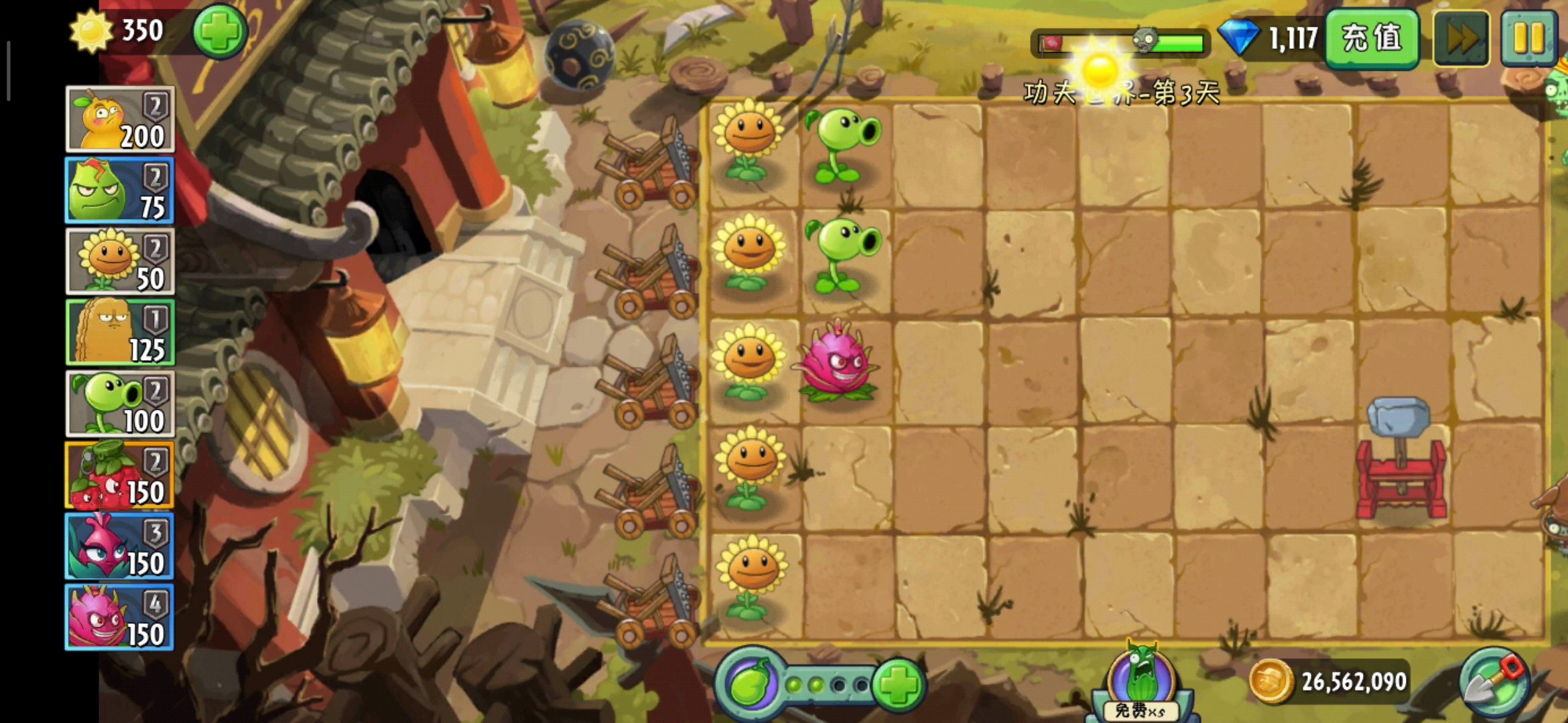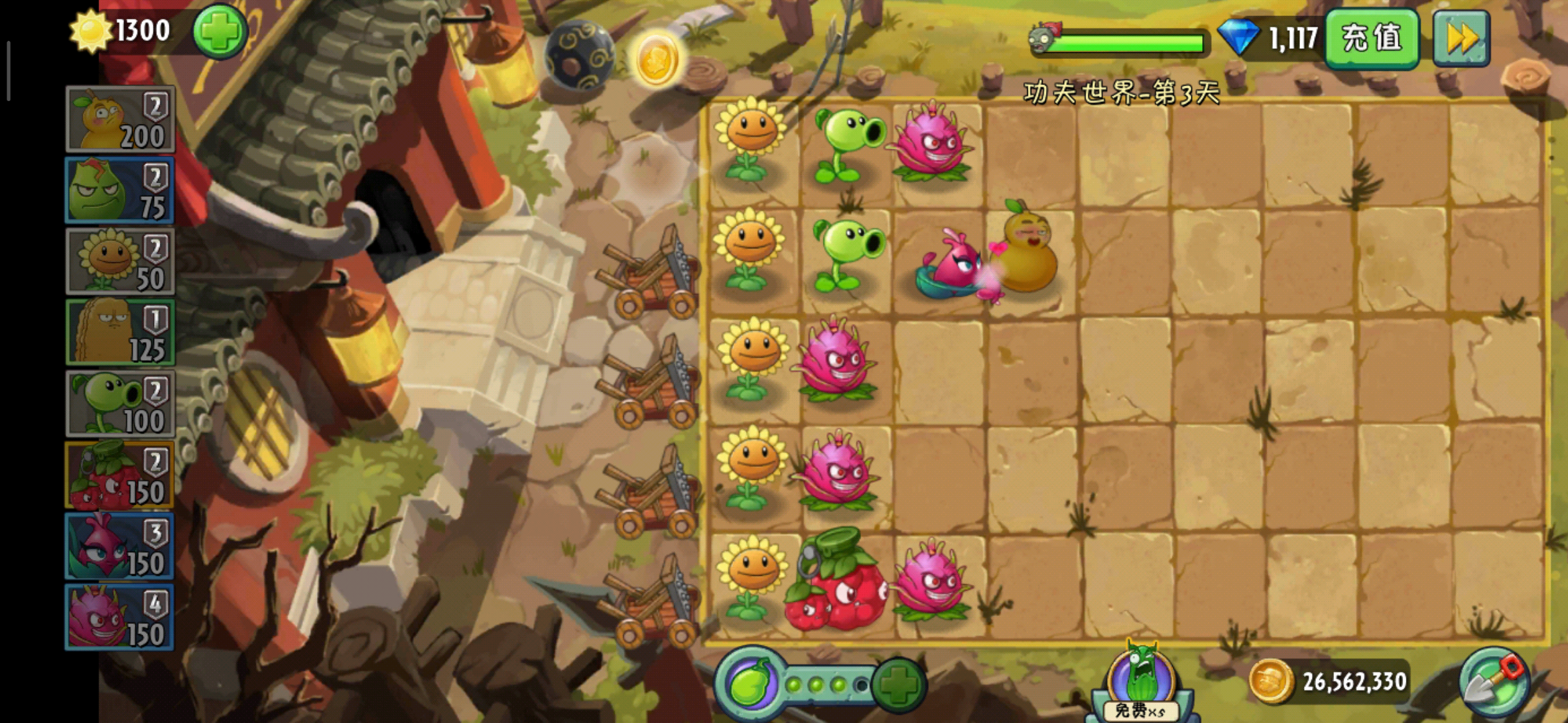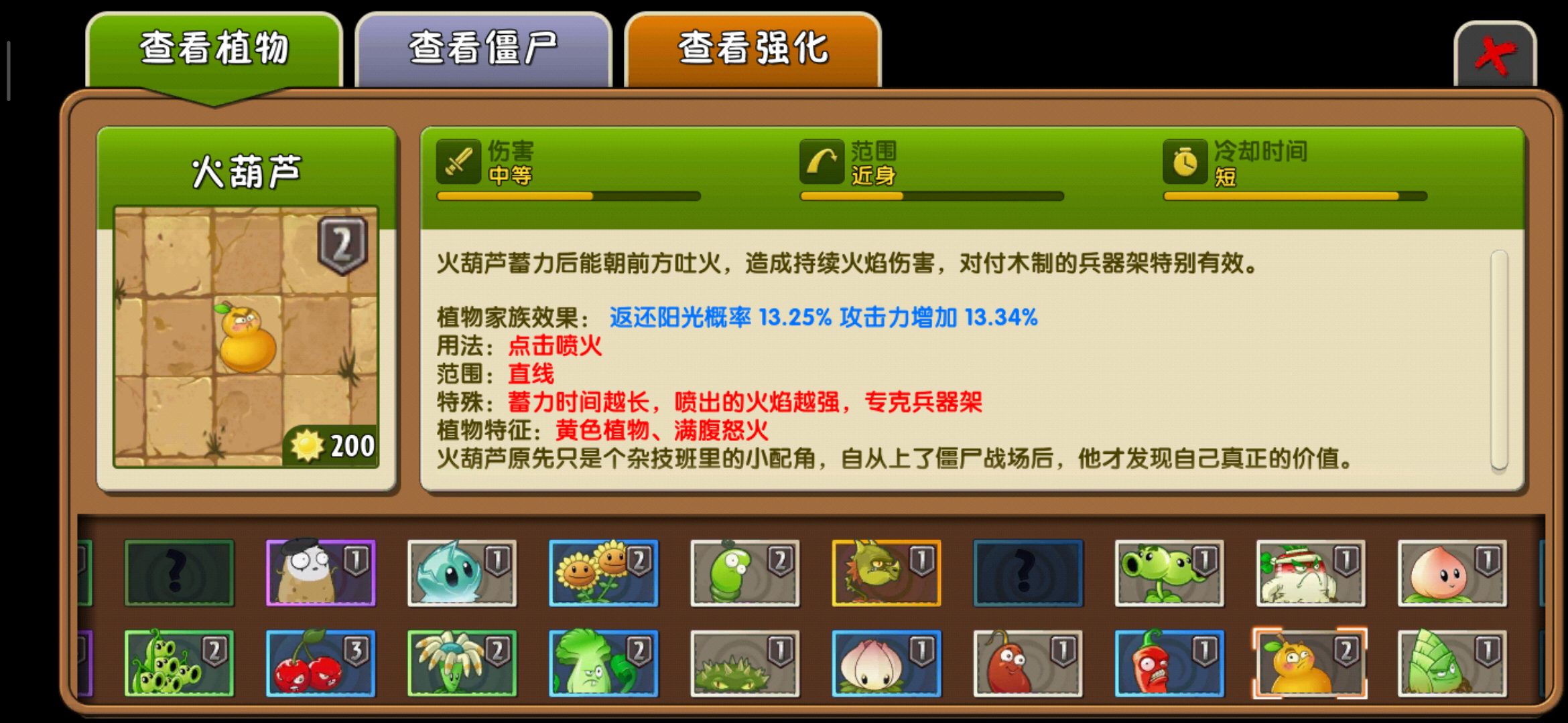 因为本身火葫芦的攻击距离就不算短,再加上火葫芦的后方,还有其他的植物对僵尸进行输出,通常情况只要不是太多难击杀的僵尸,一般僵尸是靠近不了火葫芦的,但是总有万一嘛,所以说还是要在火葫芦的前面种植坚果来保护它!还有就是火葫芦的能量豆大招,火葫芦的大招是对弈中排的僵尸进行火焰攻击,而且就算是铁桶僵尸也会直接烧死。