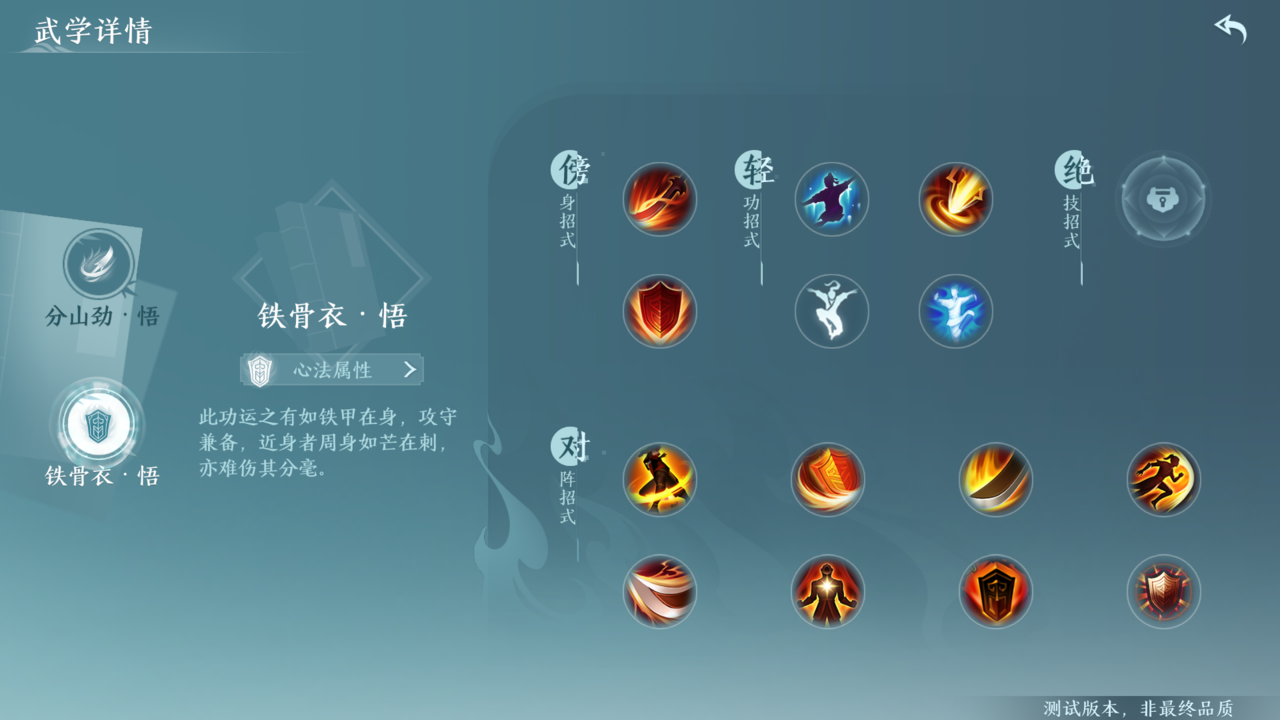 此功运之有如铁甲在身,攻守兼备,近身者周身如芒在刺,亦难伤其分毫。外功近战,以吸收伤害为主要防御手段,施展盾墙后,或可使身后的队友受到的伤害降低,或可令自己免控,在防御的间隙亦有攻守转换的反击机会。